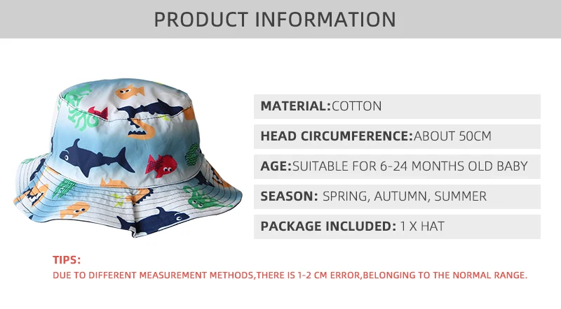 100% новый и высококачественный Описание Материал: хлопок Окружность головы: около 50 см Возраст: подходит для детей 6-24 месяцев Сезон: весна, осень, лето Посылка входит: 1 шапка Примечание: 1. Измерения проводятся вручную. Возможна погрешность в 0,5-1 см. Спасибо за понимание. 2. Обратите внимание, что возможна разница светильник цвете из-за светильник щения и экрана.