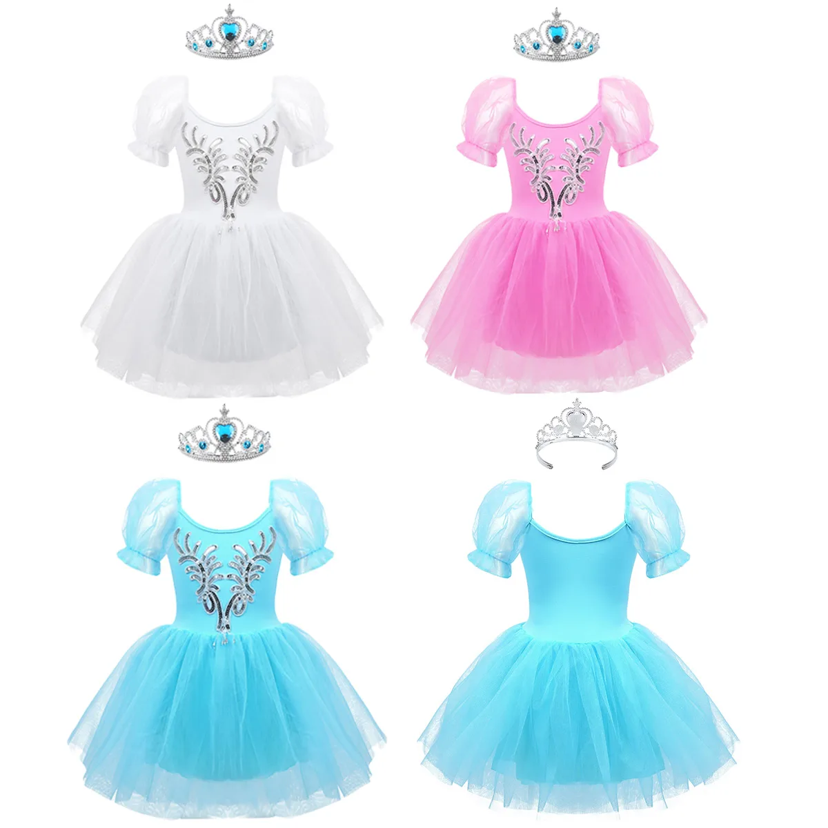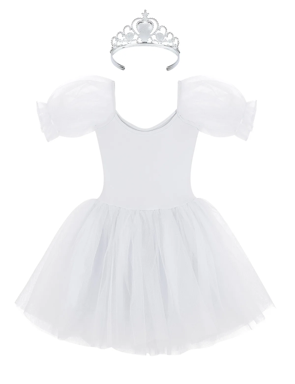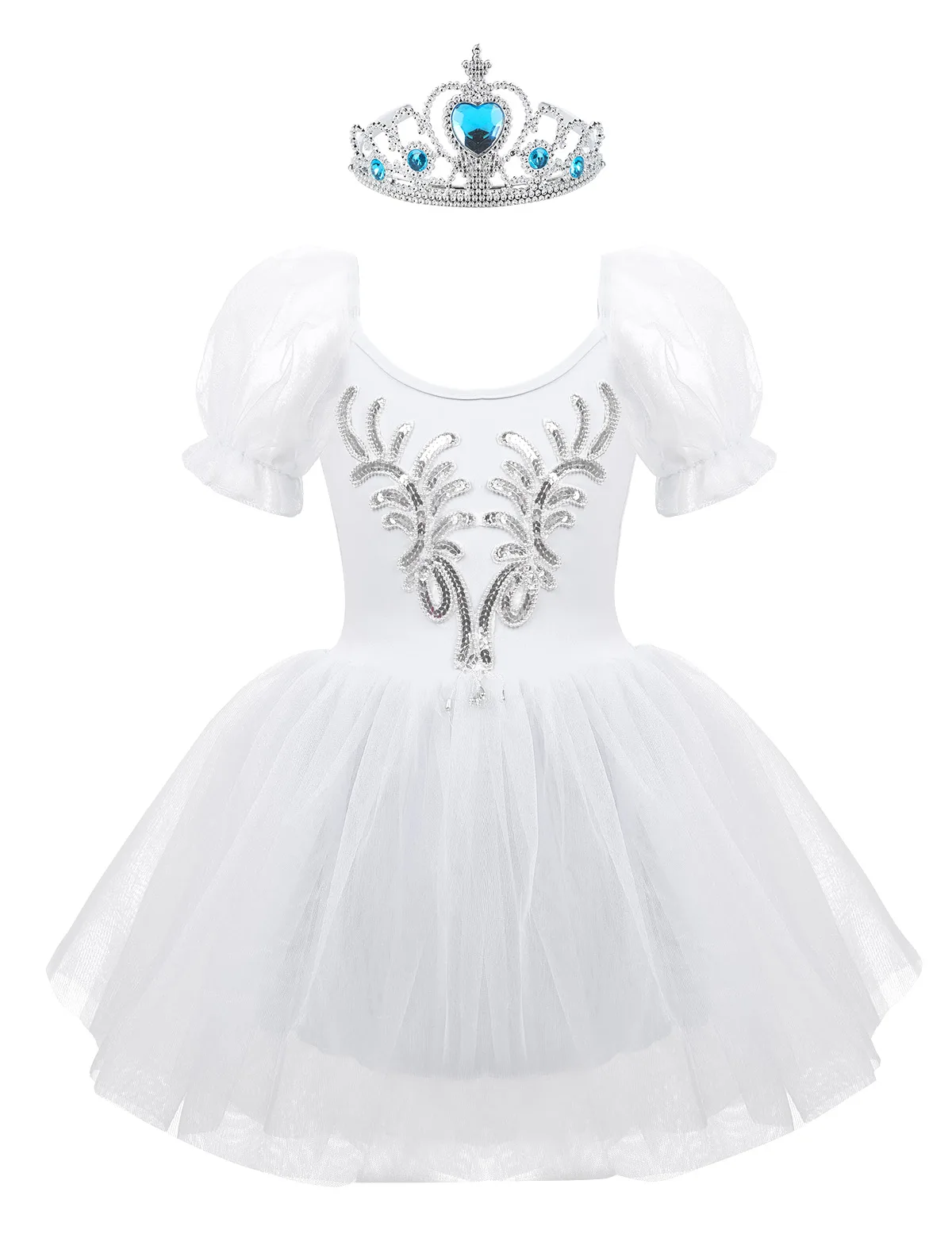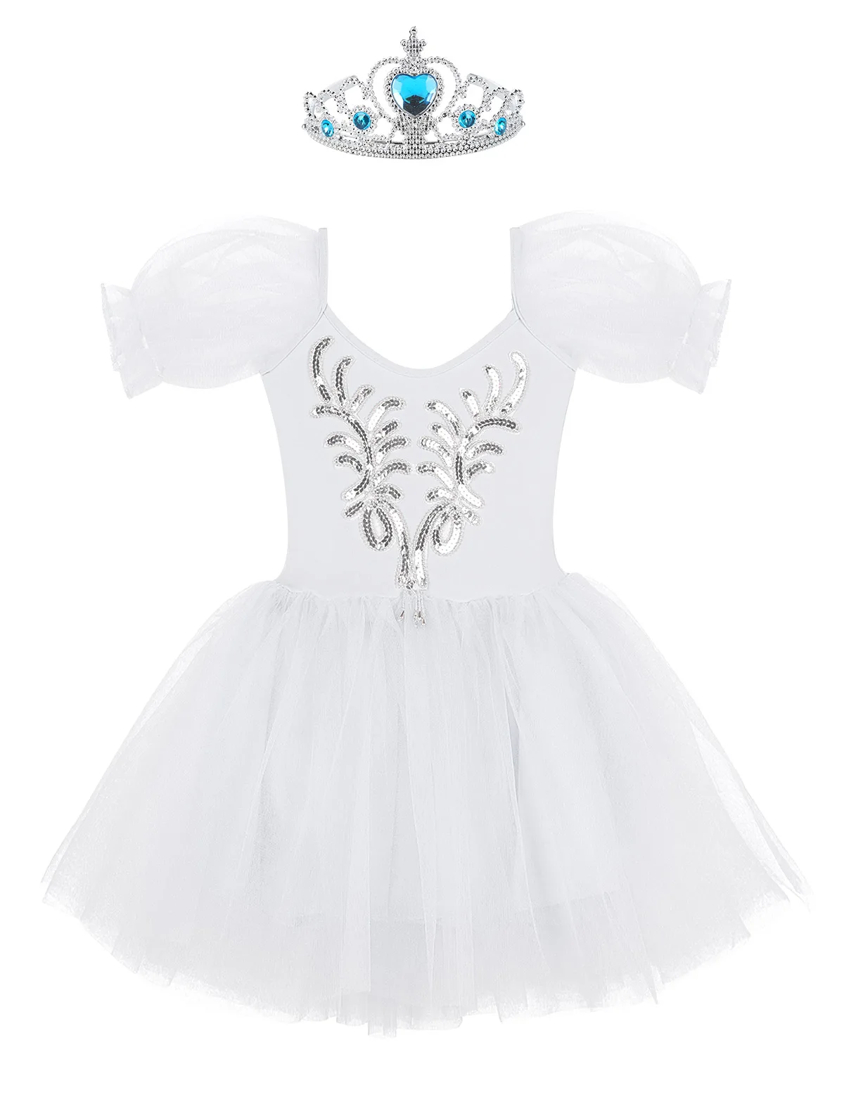 Комплект включает в себя: 1 балетное платье-пачка, 1 повязка на голову с короной
