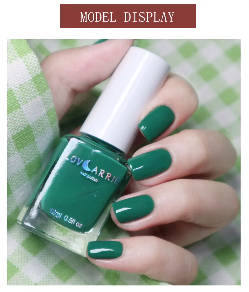 Specifications: Name: Regular Nail Polish Brand:LOVCARRIE Quantity: 1 Bottle Capacity: 12ML Color: Spring Summer green yellow gray series Fast dry ,Brand New and Superior Quality. Applications: DIY Nail Art Decorations, Nail Salon,Nail SPA Or Training. Package Content: 1 PCS LOVCARRIE 12ML Regular Nail Polish Features: Superior Quality and brand new merchandise. Fast Dry,Dry by Air. A holographic nail polish that will bring a touch of heaven to everything you do. Favorite nail polish for celebrity manicurists and nail color fans worldwide. LOVCARRIE is renowned for its high performance rich shades and exceptionally safe products No formaldehyde, toluene and DBP chemicals.All the ingredients are healthy and eco-friendly. Vegan, never tested on animals, and are all around cruelty free