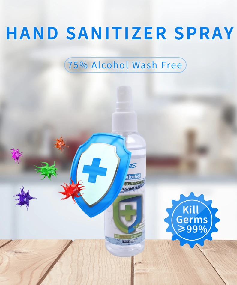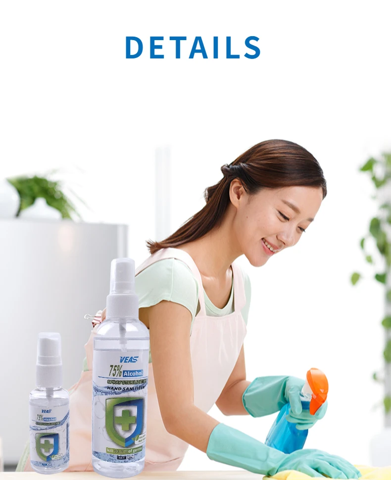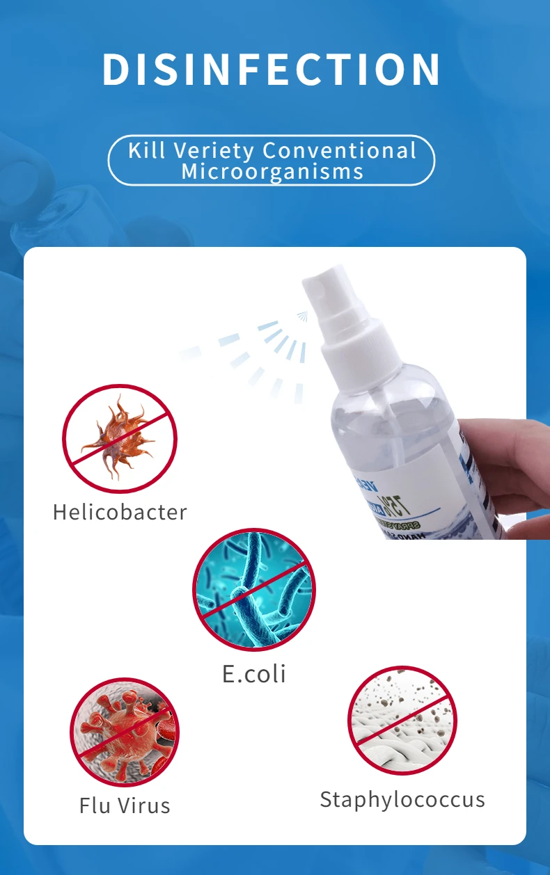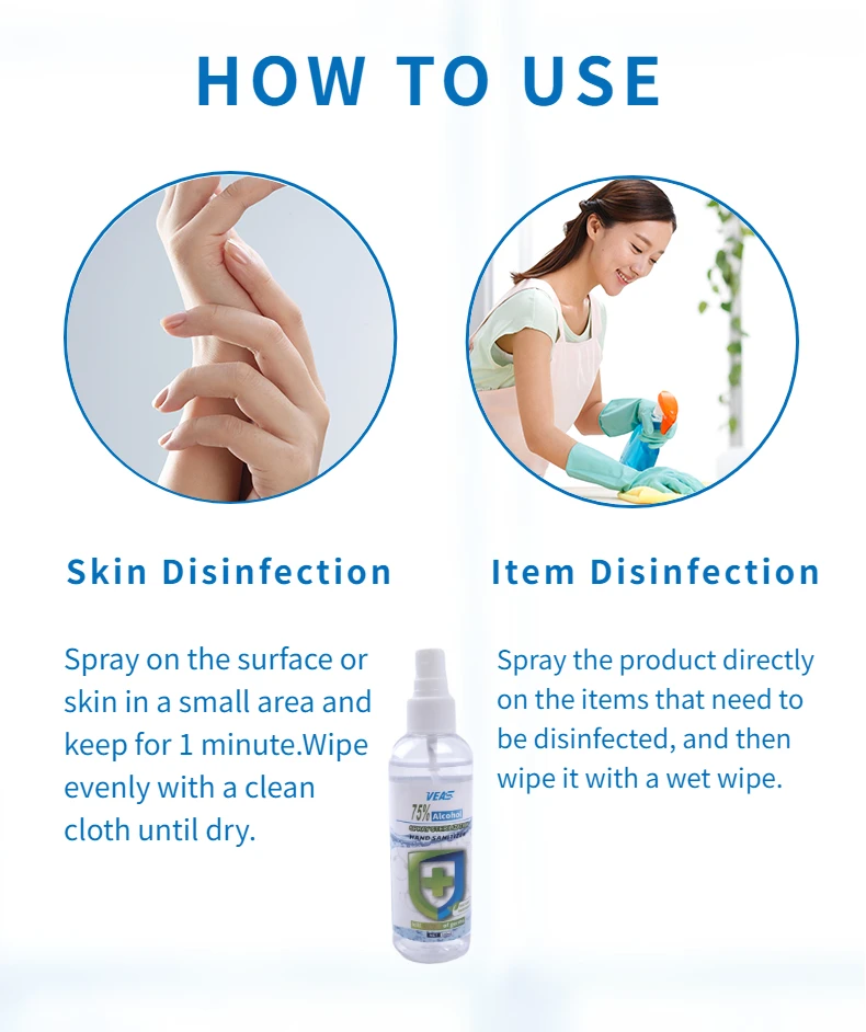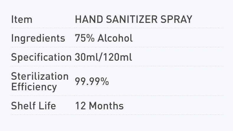 Instructions The effective ingredient of this product is 75% medical ethanol,mainly use for skin,hand,environment and object surface cleaning and disinfection,can kill a variety of bacteria.It is suitable for the disinfection of indoor surfaces in homes,hotels,factories and other public places,or the disinfection of skin surface. Usage 1.Spray on the surface or skin in a small area and keep for 1 minute. 2.Wipe evenly with a clean cloth until dry. Dosage: 1.Approximately 5-10cm from the surface, uniform spray to moist 2.Specification:30ml/120ml 3.shelf life:12 months Caution 1.External use,not oral use.Keep put of reach of children. 2.It must be used in a ventilated place and not sprayed on a large area. 3.Please keep away from fire source when using and saving. 4.Store in a cool,ventilated and dry place.