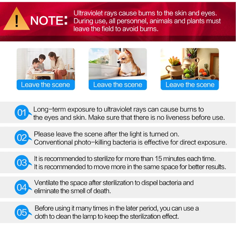 F: Когда лампа для дезинфекции работает, люди, растения и животные должны покидать место! Прямое воздействие ультрафиолетового излучения может привести к повреждению кожи и глаз человека.