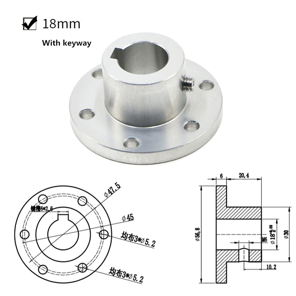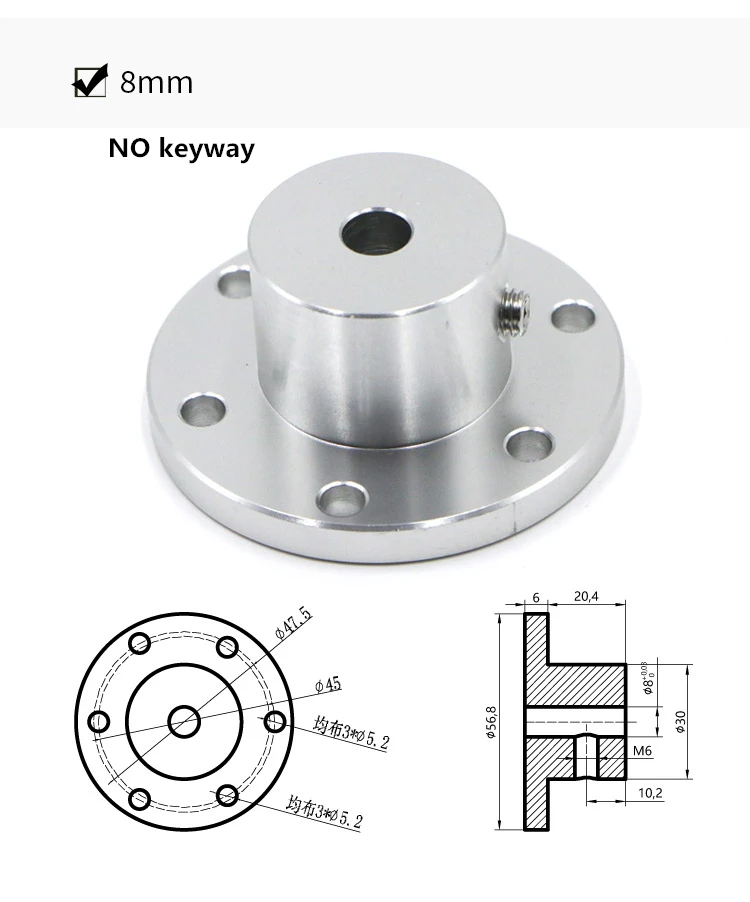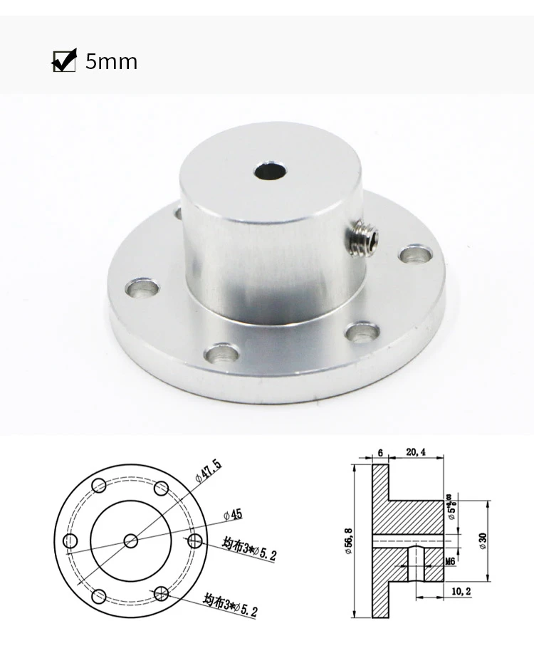 Описание: Есть три сквозных отверстия диаметром 5 мм, распределенные по кругу диаметром 47,5 мм, которые могут установить общее пшеничное колесо 100 ~ 152 мм и всенаправленное колесо на рынке. Есть три сквозных отверстия диаметром 5 мм, распределенных над кругом диаметром 45 мм, которые могут быть совместимы с пшеничным колесом диаметром 152 мм.