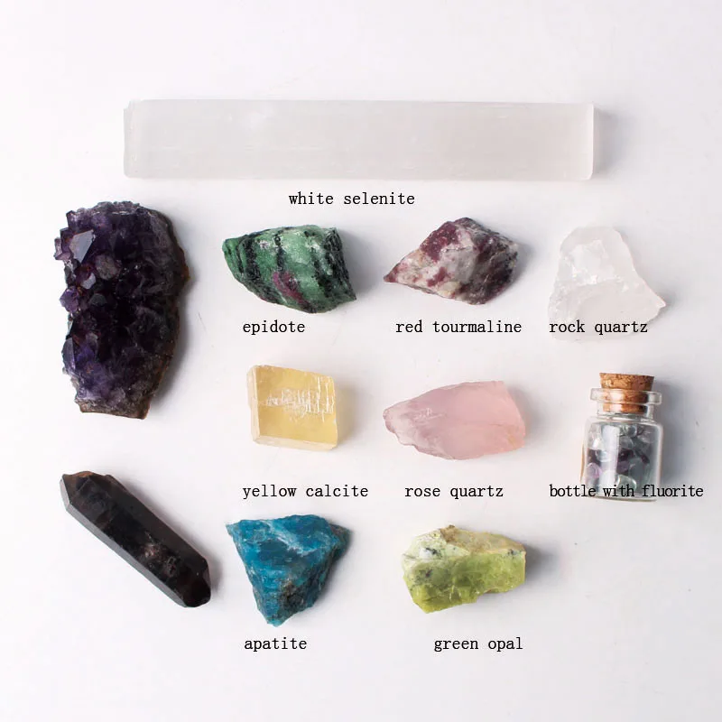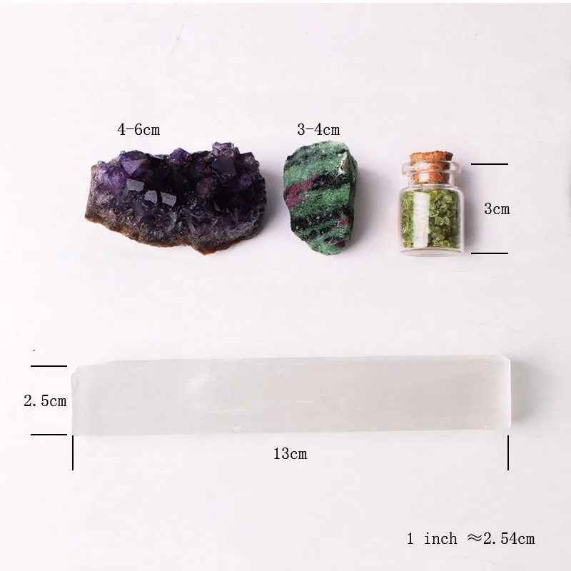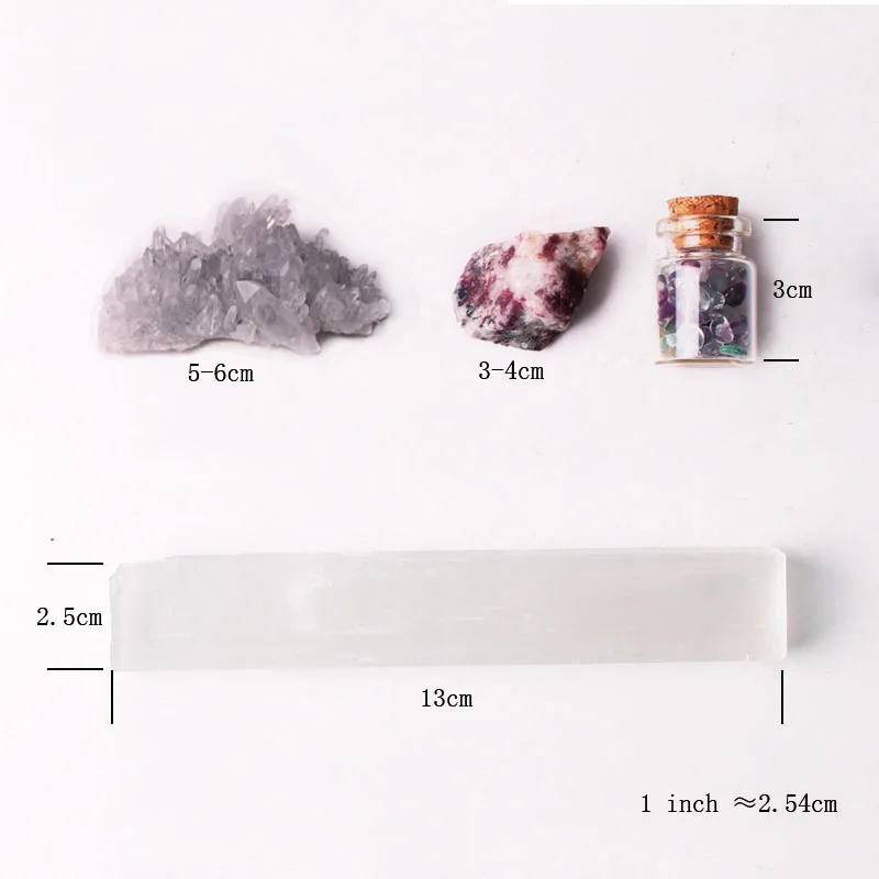 Вес кристаллов: селенит Вес: 80-130 г Аметист cluste Вес: 50-70 г Рок Кварцевый кластер: 30-60 г грубый камень: 10-20 г бутылка с чипами: 10-20 г полированный сушильный камень: 10-20 г