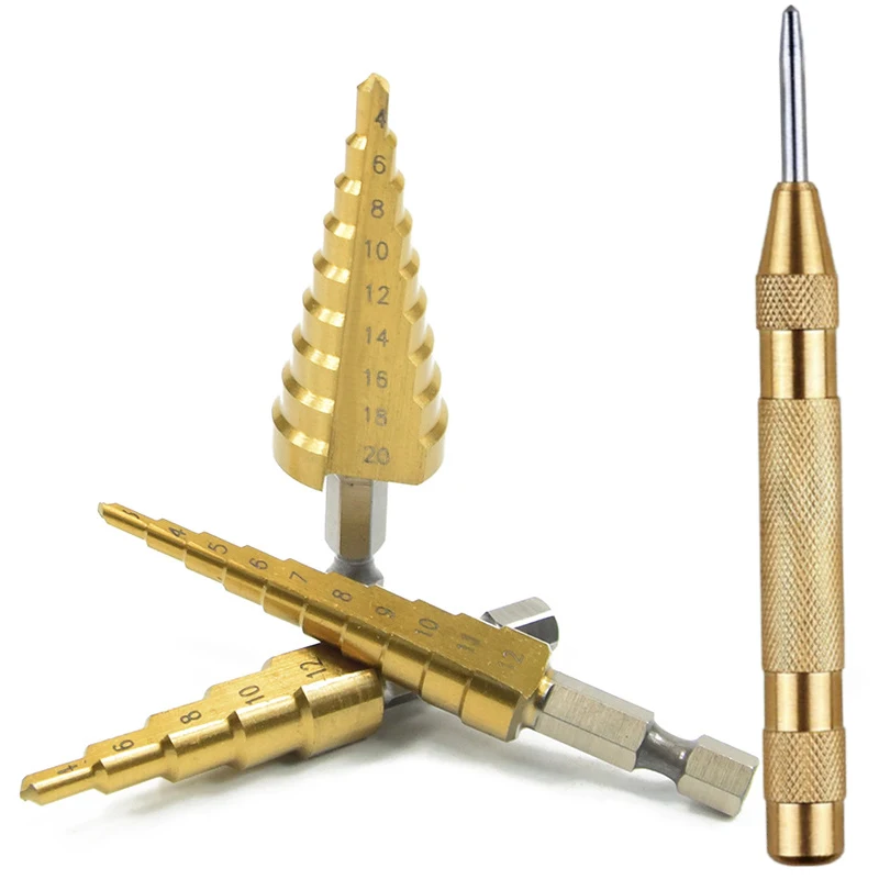 9 ступенчатых сверл: 4-20 мм (4 мм, 6 мм, 8 мм, 10 мм, 12 мм, 14 мм, 16 мм, 18 мм, 20 мм)