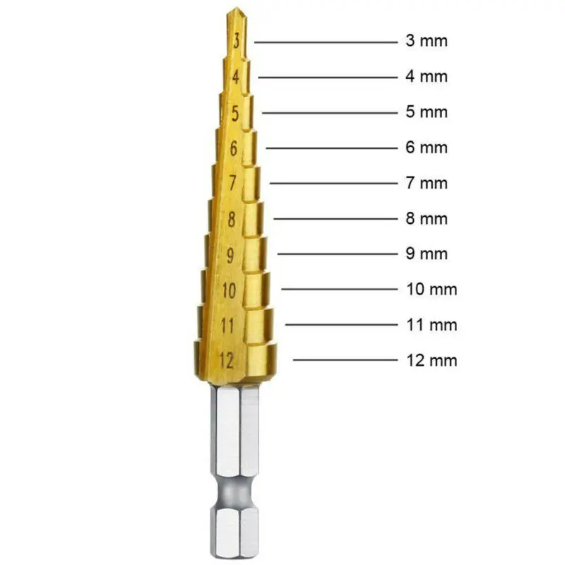 10 ступенчатых сверл: 3-12 мм (3 мм, 4 мм, 5 мм, 6 мм, 7 мм, 8 мм, 9 мм, 10 мм, 11 мм, 12 мм)