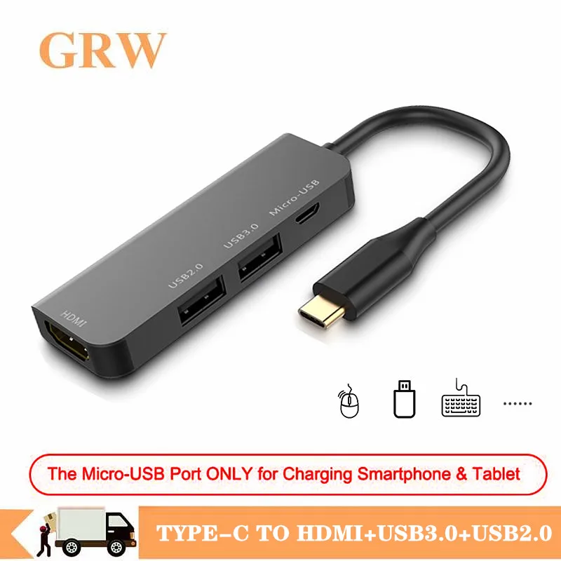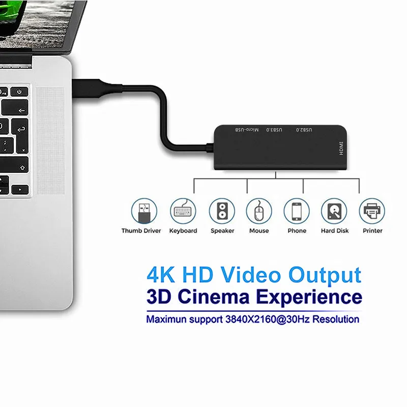Особенности: 1. Этот алюминиевый концентратор USB C будет немного жарче, чем пластиковый концентратор, который является нормальным, как и ваш алюминиевый сплав loptop/флэш-накопитель/смартфон будет горячим после длительного использования. 2. Для зарядки ноутбука через наш концентратор будет немного медленнее, чем зарядка прямые поставки с помощью настенного зарядного устройства, так как это концентратор будет стоить около 7,5 W для работы. 3. Если порт usb-c не поддерживает функцию зарядки, он не может заряжать ноутбук через этот адаптер, сначала подтвердите, поддерживает ли порт usb-c зарядку вашего устройства. 4. Для видеовыхода 4K он поддерживает только частоту обновления 30 Гц и не поддерживает частоту обновления 60 Гц. Кроме того, кабель hdmi должен быть менее 5 м. 5. При подключении к MacBook Pro, это может повлиять на сеть Wi-Fi, мы предлагаем использовать 1m USB 3,0 удлинитель, чтобы держать устройство USB3.0 вдали от хост-ноутбука, чтобы уменьшить помехи в сети. 6. Не рекомендуется заряжать телефон через usb-порт, так как usb-порт только может предложить ток 1,5a и будет медленно заряжать ваш телефон. 7. Не используйте 2 жестких диска одновременно или много устройств питания через порт USB. 8. Для ноутбуков Xiaomi, при подключении к оригинальному адаптеру питания через концентратор usb c, экран ноутбука может продолжать мигать, мы предлагаем перейти на другой адаптер питания PD, такой как для Apple, для Dell или другого адаптера питания PD для зарядки ноутбука. При неподключении оригинального адаптера питания xiaomi все функции работают. Подробности: Вход: USB C * 1 Выход: USB 3,0*1; USB 2,0*1; HDMI * 1; Micro USB * 1 Упаковочный лист: 1 х usb-кабель с разъемами типа C и Micro USB 3,0 2,0 HDMI 4 Порты и разъёмы концентратор