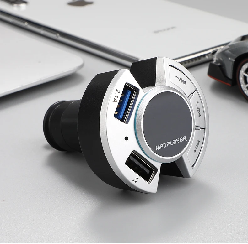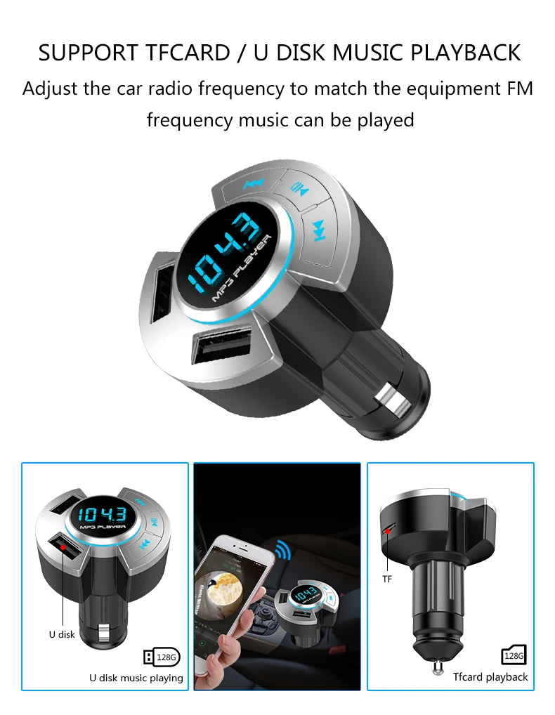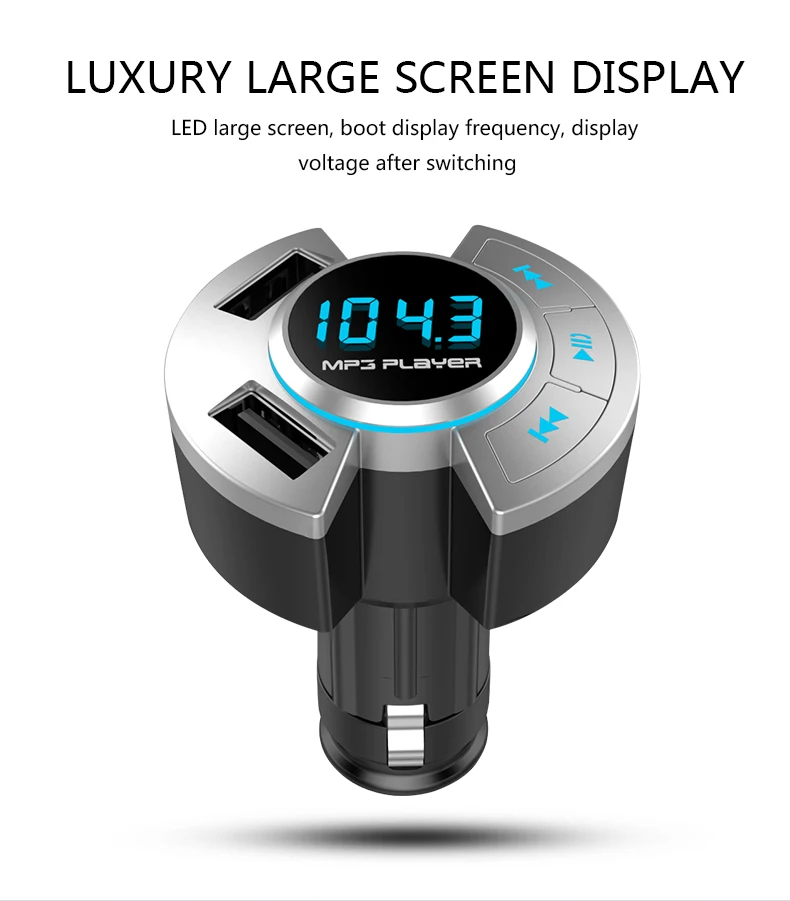 BT17 автомобильный fm-передатчик Mp3 плеер Bluetooth совместимым 5,0 памяти Dual USB 2.1A автомобиля Зарядное устройство Поддержка Шум снижение TF карта Автомобильный комплект Описание: 1. Bt Версия 5,0, поддержка Bt вызова, Bt передача музыки, номер звонящего.2. Поддержка tf-карты/U дискового плеера и функции чтения карт, поддержка MP3/WMA формат музыки.3. TF/U диск поддерживает 128 ГБ, USB порт для зарядки 2.1A.4. Статус голосовой подсказки звонящего (имя памяти воспроизведения/состояние подключения bt)5. Цифровой дисплей трубки, экран показывает только частоту, и напряжение может быть отображено после переключения.6. Частота памяти и функция воспроизведения музыки.7. Частота излучения FM 87,5-108,0 МГц Характеристика: 1. Версия Bt: 5,0 + EDR 2. Обработка звука Bt: A2DP 3.Bt микрофон Эффективное расстояние: 0,5-2 м 4. Расстояние передачи Bt: 10 м 5. Экран дисплея: цифровой дисплей 6.USB зарядка: USB1:1A + 128GB/USB2: 2.1A 7.TF и USB: 128 ГБ 8. Формат музыки: MP3/WMA 9. Частота излучения FM: 87,5-108,0 МГц 10. Рабочее напряжение: 12-24 В 11. Рабочая температура: 0-40 ℃ 12. Степень искажения: <0,1 13. Отношение сигнал-шум:>60 дБ 14. Размер изделия/Вес: 8*8,5 см/63 г 15. Цвет: черный Включенная Упаковка: 1 * Автомобильный fm-передатчик