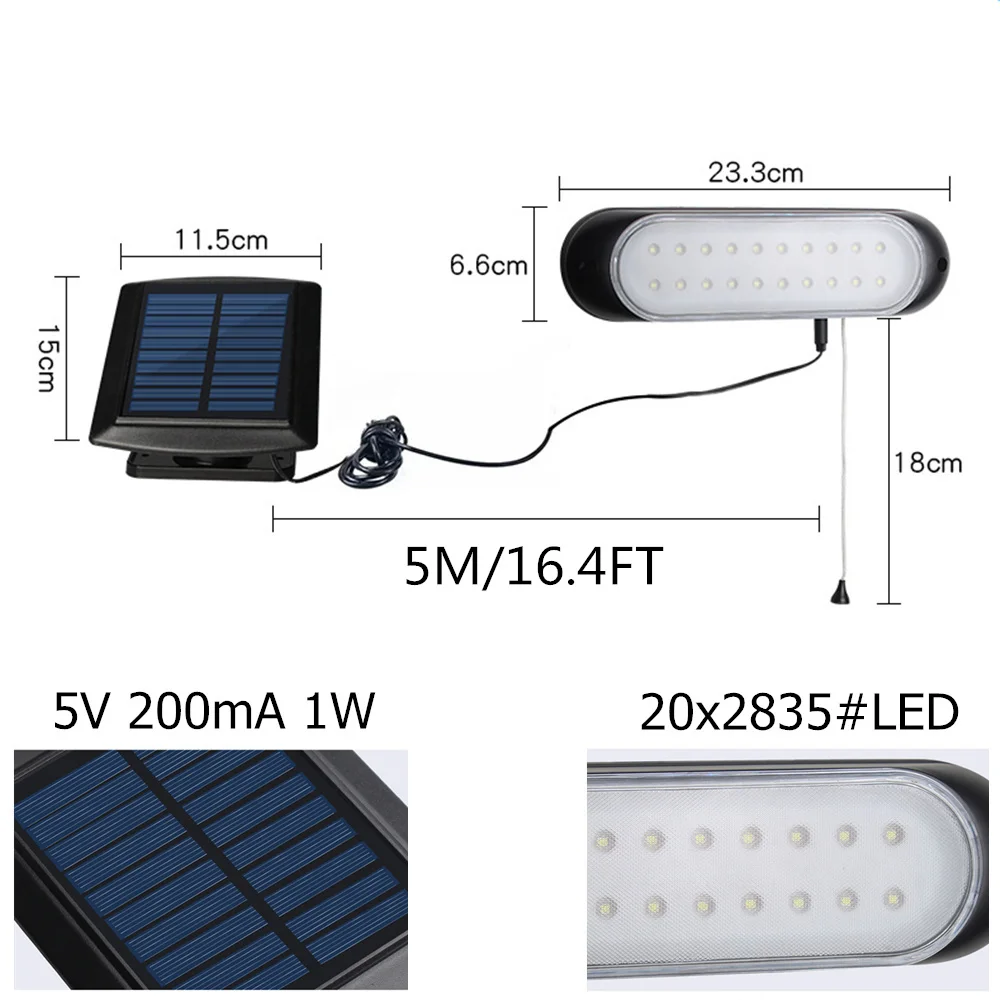 Панель солнечных батарей: 5v 200MA 1 Вт Аккумулятор: li-ion 18650,3.7V 1500mAh Водонепроницаемость: IP55 Больше работы: Держите солнечную панель для подзарядки от солнечной батареи, ВКЛ или ВЫКЛ по желанию вытяжной линии.