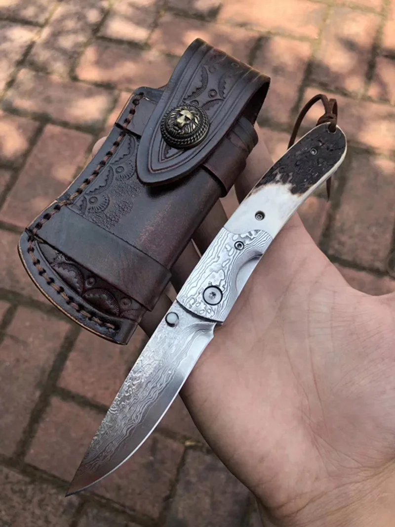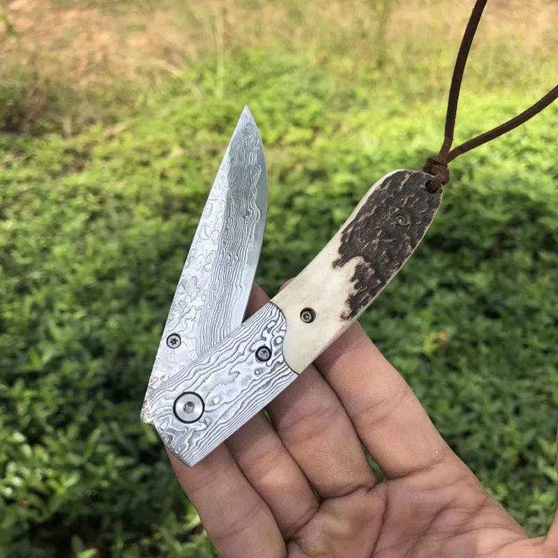 Складной нож дамасская сталь лезвие натуральная ручка Олений Рог карманные ножи для кемпинга выживания Охота тактический инструмент EDC