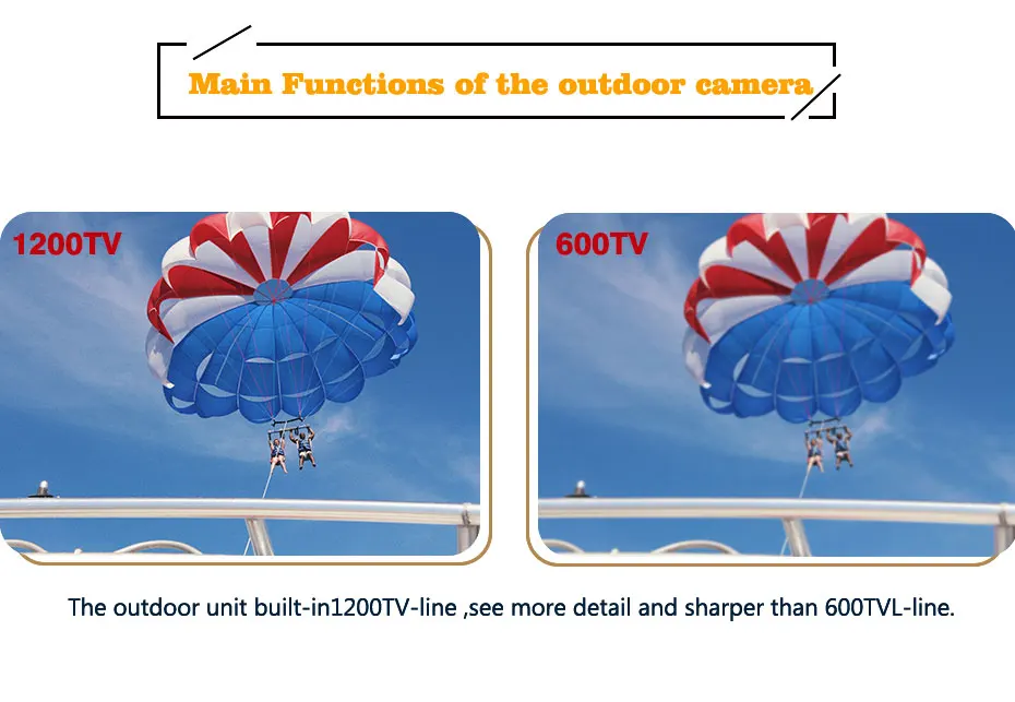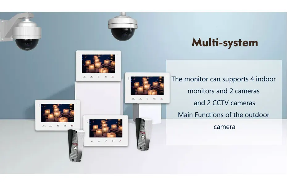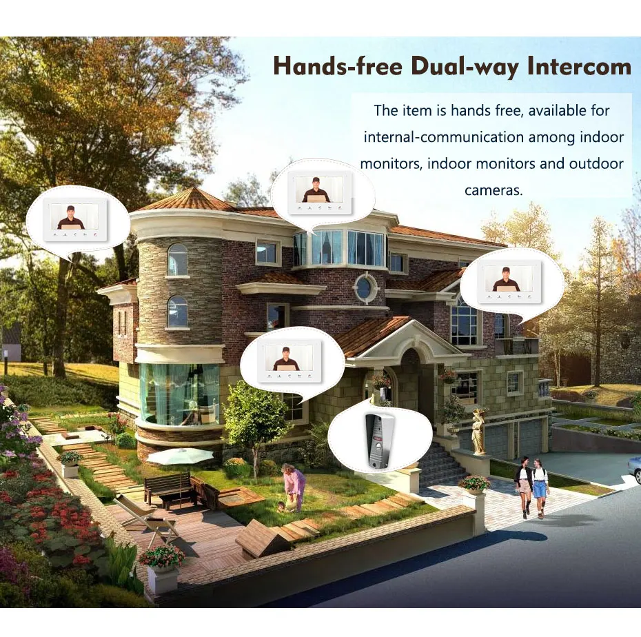 1. Сенсорный экран для внутреннего монитора 2, встроенная функция обнаружения движения 3, поддержка Max.32G sd-карты (не включены) 4, 1200 наружная камера дверного звонка 5100 градусов угол обзора