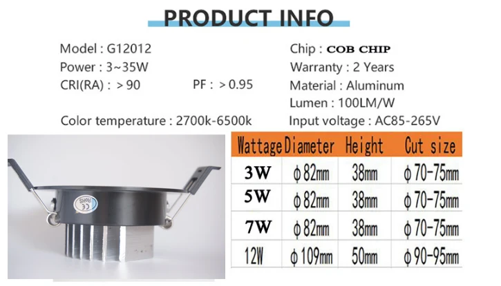 Модель: 3 Вт, 5 Вт, 7 Вт, 12 Вт, потолочный светильник COB Светодиодный чип: (светодиодный чип) Цвет: теплый белый (3000K); Чистый белый (4200-4500K); Холодный белый (5500-6500K) Интенсивность света: 3 Вт = 280 лм 5 Вт = 460 лм 7 Вт = 680 лм 12 Вт = 1000 лм Угол луча: 60 градусов Мощность: 3 Вт, 5 Вт, 7 Вт, 12 Вт Светодиодный рабочий диапазон температур: -25 °C - + 65 °C Длительный срок службы до 50 000 часов Отличная светоотдача Одобрено: CE/RoHS/FCC/UL 2 года бесплатной замены Стандартные приложения Дом, магазин, офис, отель, район, коммерческий Посылка, содержимое 1 шт. светодиодный светильник, Внешний светодиодный драйвер, 1 шт.
