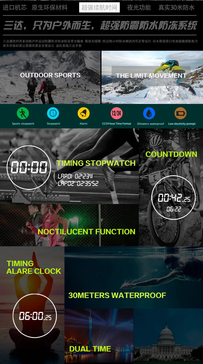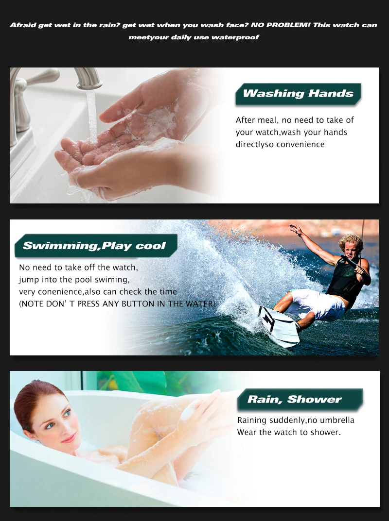 -3 АТМ/30 м водонепроницаемый (поддерживает холодный душ и плавание, не эксплуатирует часы под водой, не поддерживает горячую воду);