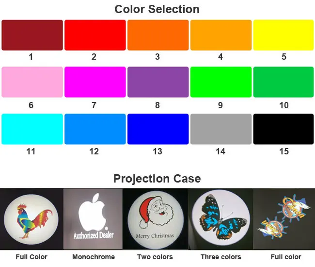 1. Сначала проверьте цвет вашего логотипа. 2. Отправьте нам изображение логотипа в векторном формате (или более четкое изображение логотипа). 3. Этот продукт не оснащен вилкой. Теплые советы: 1. Одноцветный свет: лампа + одноцветная пленка 2. Два цвета света: лампа + два цвета пленки 3. Три цвета света: лампа + три цвета пленки 4. Белый цвет не входит в расчет цвета 5. Цвет света должен быть выбран из следующих цветов (за исключением цветной пленки) 6. Наружные Проекционные Огни не имеют вилки, потому что обычно нет наружной розетки, вам нужно продлить длину провода, который вы хотите