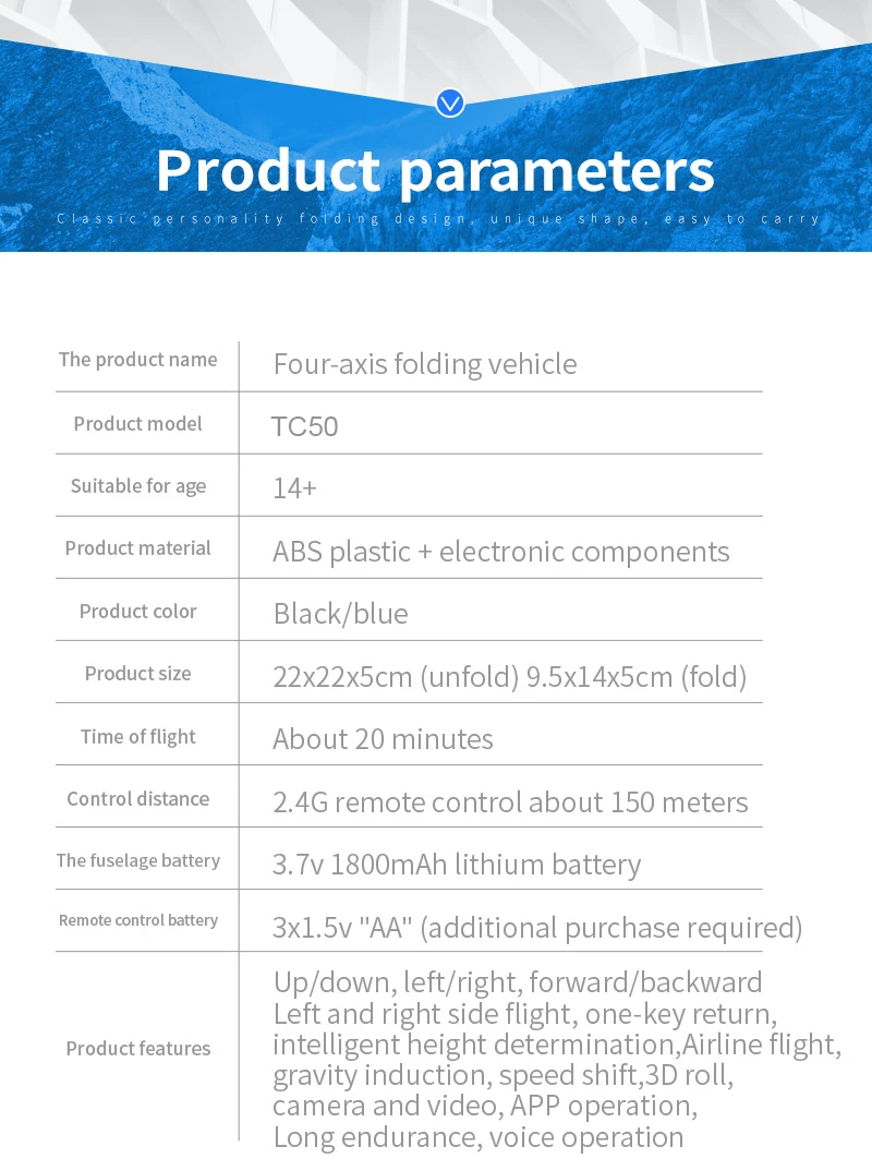 Описание: Название бренда: TEDH-CORE Пункт NO. : TC50 Частота: 2,4G Канал: 4CH Gy ro: 6 ax is Мотор: 8*23 мм, без щетины Квадрокоптер Батарея: 3,7 V 1800mAh литий-полимерный (все указанные аккумуляторы входят в комплект поставки) Передатчик Батарея: 3x1,5 AAA Батарея (не входит в комплект) Время полета: 15-17 минут Время зарядки: 120-150 минут Расстояние R/C: 80-100 м Летающий Вес: 180 г (с аккумулятором) Цвет: как на изображении Камера опционально: 720P/2,4G WiFi 1080P/2,4G WiFi 4K HD FOV: широкий угол обзора 120 ° Пикселей: 720P-изображение/видео: 1280*720 1080P-изображение: 1920*1088, видео: 1280*720 (сохранено на мобильный телефон) 1080P-изображение: 1920*1088, видео: 1920*1080 (сохранено на SD-карте) 4K-изображение/Видео: 3840*2160 (Поддержка IOS 6 или выше и Android high-end системы) 4K -- изображение/Видео: 2560*1440 (сохранено на SD-карте) Расстояние Wi-Fi: 50-70 м Четырехъядерным процессором, Размеры: 22*22*7,5 см (в разложенном виде), с реквизит ограждение насоса) 15*11*7,5 см (руки в сложенном виде) Особенности: -Со складными ручками, маленького размера, легко носить с собой. -Функция удержания высоты обеспечивает стабильный полет. -С функцией Wi-Fi можно подключать приложение, АПК-систему для съемки фотографий, видео, передачи в реальном времени через Изображение камеры телефона. -Есть 3 камеры, которые можно выбрать. С широкоугольной камерой 720P, 1080P или 4K HD, передают широкие фотографии и видео с высоким разрешением. -При безголовом режиме, не нужно регулировать положение самолета, прежде чем лететь. -Функция возврата с одним ключом позволяет легко находить путь домой. -Траекторный полет. Проведите полет по экрану, и Дрон будет осуществлять автономный полет по назначенному пути. -С 3,7 V 1800mAh литий-ионная аккумуляторная батарея, время полета до 17 минут. -2,4 ГГц Технология, принятая для защиты от помех. -4 канала, которые могут выполнять взлет, спуск, движение вперед, назад, левую боковую полет, праворукий полет и поворот на 360 °. -6-a-xis gy ro, который может иметь более стабильный полет и легко управлять. -Он имеет 3 уровня скорости полета для переключения, которая может сделать больше удовольствия с летящим. -Корпус квадрокоптера изготовлен из высокопрочной и устойчивой инженерной пластмассы, легкий и долговечный. -Пожалуйста, обратите внимание: Если вы покупаете объектив 4k, из-за большого количества информации, карта памяти должна использовать высокоскоростную карту или брендовую карту. Функция: вверх/вниз, вперед/назад, поворот влево/вправо, поворот влево/вправо, бока, f светильник, 3 уровня f светильник скорость, 3D прокатки, светодиодный светильник, Безголовый режим, автоматический возврат одним нажатием кнопки, режим удержания высоты, WiFi FPV, светильник траектории F, камера/видео Пожалуйста, обратите внимание: Если вы покупаете объектив 4k, из-за большого количества информации, карта памяти должна использовать высокоскоростную карту или брендовую карту. E520 может использовать пульт дистанционного управления и приложение для взлета одной кнопкой. Посылка включает в себя: 1 x RC Quadcopter 1 x пульт дистанционного управления 1x3,7 V 1800mAh литий-полимерный Батарея (можно выбрать Батарея количество при размещении заказа) 1 x USB кабель для зарядки Защитный чехол, 4 шт. 2 запасных лезвия 1 х Отвертка 1 x Руководство пользователя