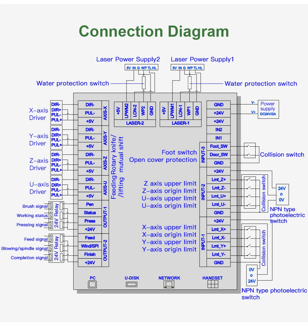 4) 4-осевое управление двигателем (X, Y для движения самолета, Z для подъема роторного ножа или синхронного движения с двумя головками (двухголовые взаимозаменяемые модели, включая модели с двумя головками и двумя головками), U для кормления или подъема платформы);