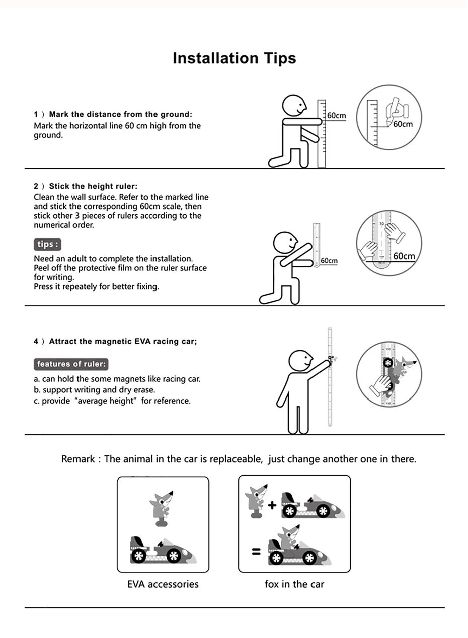 Шаг 1. Снимите резиновую бумагу и Наклейте на стену. Шаг 2. Поместите фотографию и притяните на магнитную рамку. Шаг 3. Запись высоты и даты.