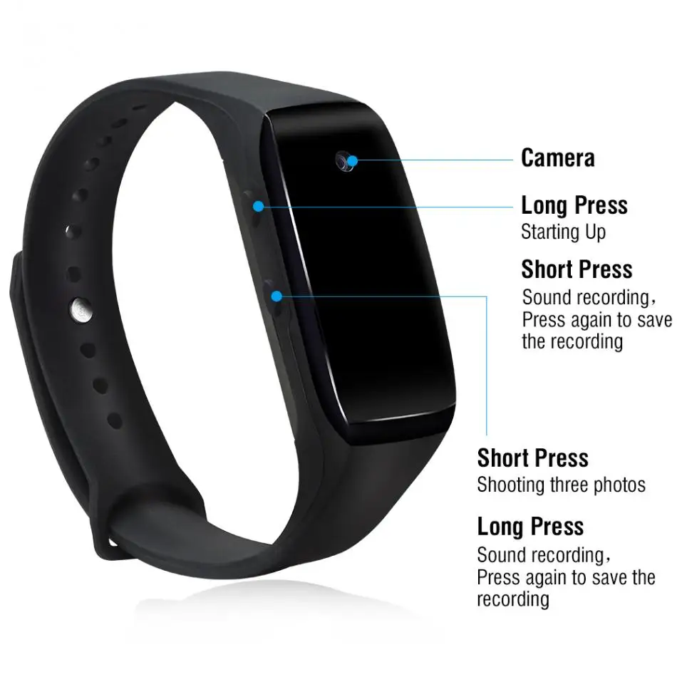Этот продукт является первым носимым браслетом с HD1080P камерой и функцией внешнего хранения,И поддерживает карту Micro SD большой емкости. Этот многофункциональный браслет имеет различные практические функции, изысканный внешний вид, стабильное качество, широкое использование, принесет вам совершенно новый опыт использования.
