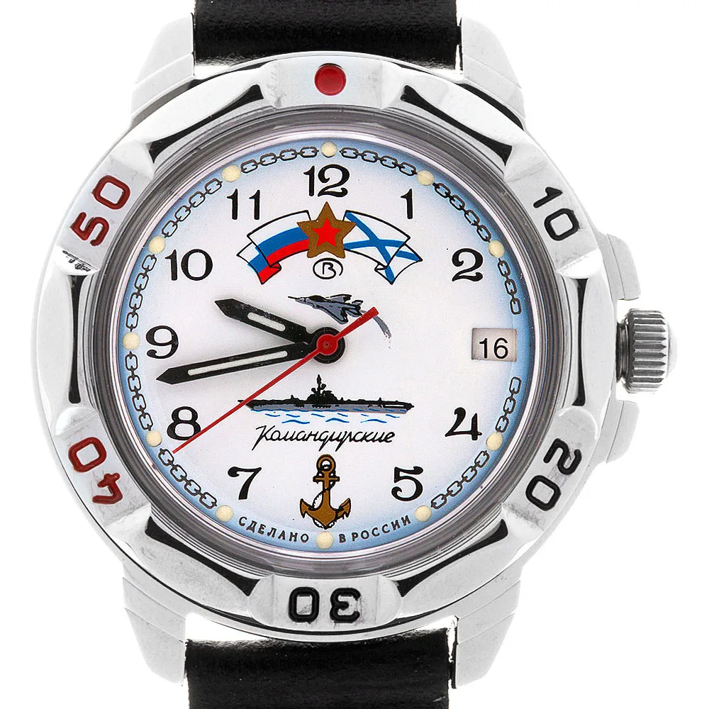 Командирские Классика. В механизме 17 камней. Запас хода 36 часов. Противоударное устройство оси баланса. Вращающийся безель. Завинчивающаяся заводная головка с защитой.Часы с оригинально выполненным циферблатом отлично подойдут для повседневного общения со временем.