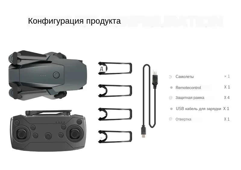 1 х E58 Rc Квадрокоптер 1 х пульт дистанционного управления 1 х 3,7 в 500 мАч Lipo батарея (можно выбрать количество батареи при заказе) 1 X usb-кабель для зарядки 4 X защитная крышка 4 запасных лезвия 1 х Отвертка 1 х Руководство пользователя