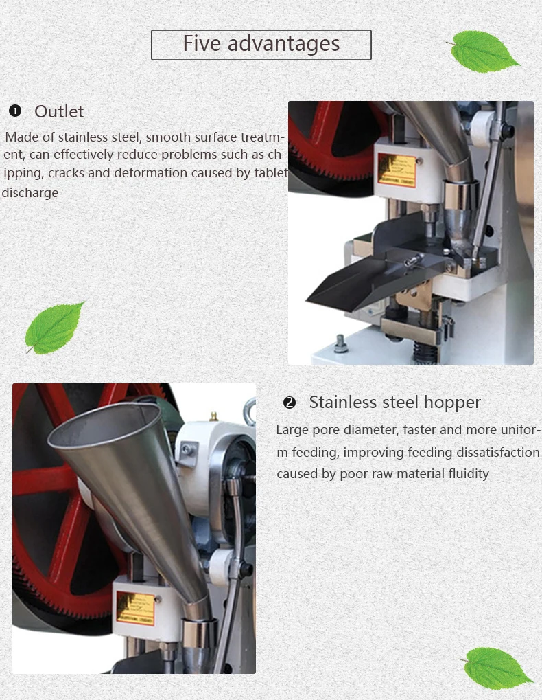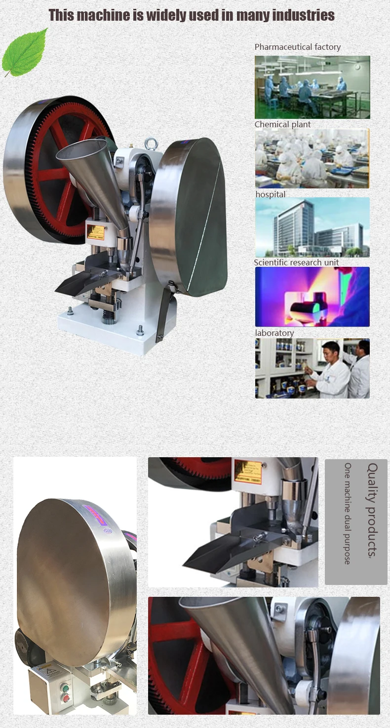 Отличия от других машин: регулируемые планшеты с наружным диаметром 25 мм могут быть прессованы большим давлением. Можно прессовать только круглые, неправильные и неправильные формы в пределах 25 мм. Он поставляется с круглой формой, и вы можете выбрать свой собственный размер. Размер, мастер поставляется после установки и ввода в эксплуатацию, другие формы могут быть настроены, такие как традиционные китайские таблетки для литья лекарств, для молочных таблеток, таблеток кальция, таблеток соли, шипучих таблеток и так далее. Способен сжимать порошок и гранулированное сырье в таблетках, которые могут быть широко использованы в фармацевтических заводах, химических заводах, больницах, научно-исследовательских блоках, лабораторном пробном производстве и производстве небольших партий. Эта машина оснащена только парой штамповочных штампов. Глубина наполнения и толщина таблетки материала может быть скорректирована, что может удовлетворить требования фармацевтической промышленности для прессования китайских и западных лекарственных таблеток и других отраслей промышленности для прессования подобных продуктов.