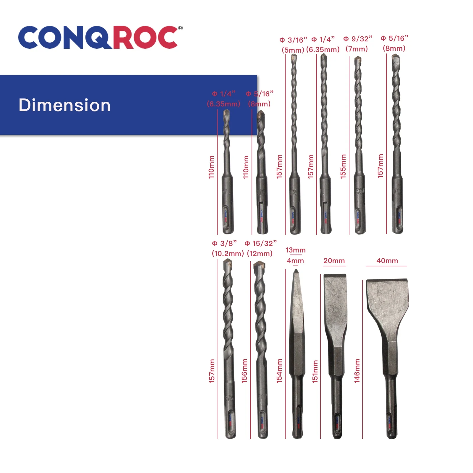 -Материал: Твердосплавный Наконечник YG8 и 40CR -Хвостовик: SDS PLUS -Диаметр сверления: 3/16 " (5 мм), 1/4" (6,35 мм), 9/32 " (7 мм), 5/16" (8 мм), 3/8 "(10,2 мм), 15/32" (12 мм) -Длина: 110 мм, 146 мм, 151 мм, 154 мм, 157 мм