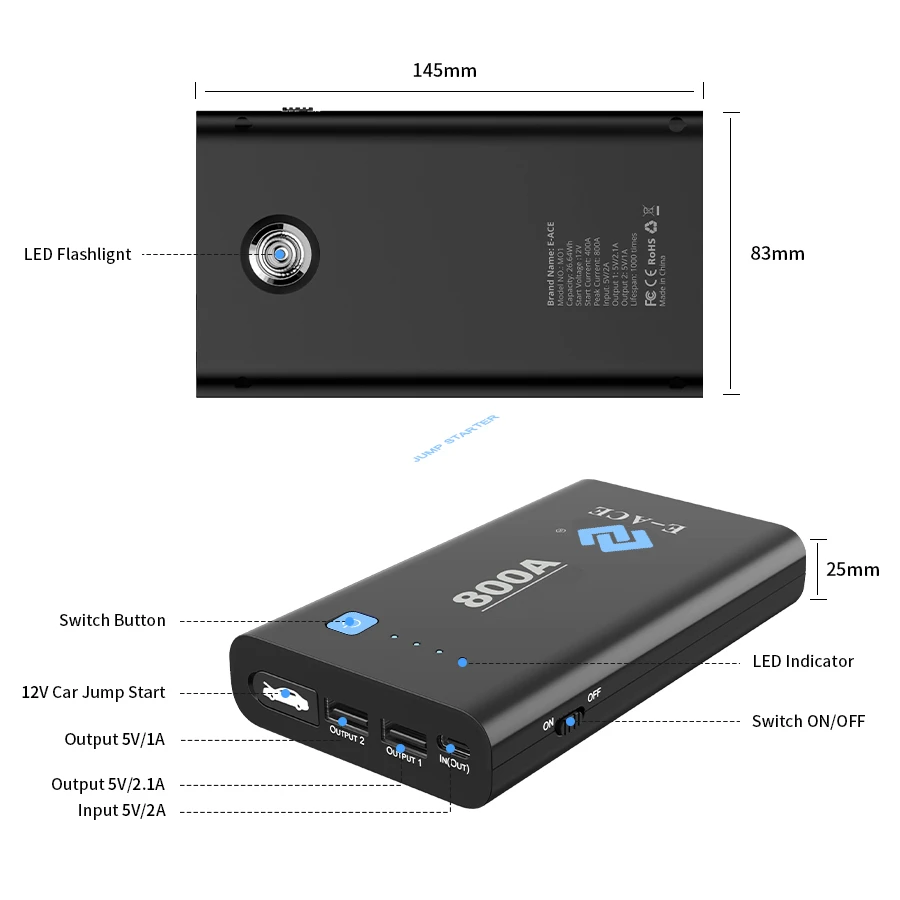 Мощный стартер с пиковым выходом 800A не имеет проблем с запуском большинства транспортных средств с газовыми двигателями до 8,0л или дизельными двигателями до 6,5л. Мощный усилитель литиевой батареи-до 60 скачков начинается с одной зарядки.