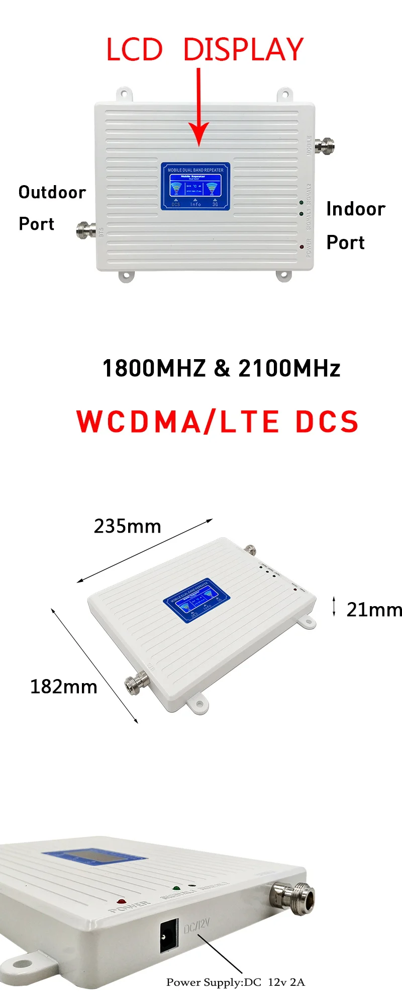 Два частоты 1800/2100 МГц GSM DCS WCDMA LTE 3G 4G двухдиапазонный мобильный усилитель сигнала Gain70 GSM сотовый ретранслятор 4g усилитель DCS 1800 МГц Частотный диапазон: Подключение: 1710-1785 МГц; Нисходящее Соединение: 1805-1880 МГц WCDMA 2100 МГц Частотный диапазон: Uplink:1920-1980 МГц; Downlink:2110-2170 МГц Коэффициент усиления: 70 ± 2 дБ Как работать: 1. Наружная антенна (антенна Yagi) получает сигнал от базовой станции. 2. Затем отправляет сигнал ретранслятору через длинный кабель 3. Ретранслятор получает сигнал и улучшает его. 4. После этого сигнал в внутреннюю антенну (панель/потолок/штыревая антенна), наконец, ваш мобильный телефон будет улучшаться.