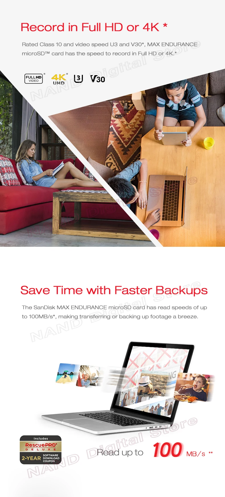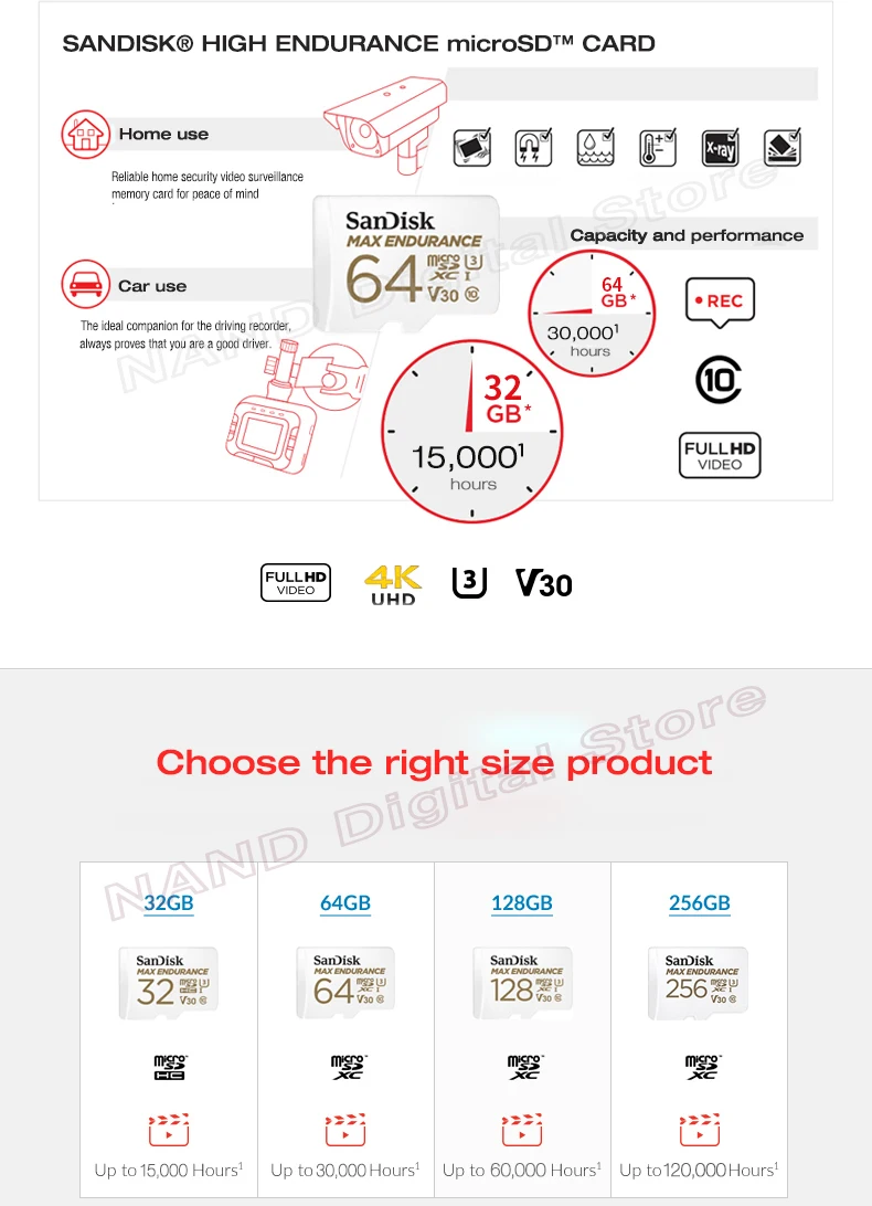 Класс 10 и скорость видео U3 и V30 * 4, карта памяти SanDisk MAX ENDURANCE microSD имеет скорость записи в формате Full HD или 4K. * 3