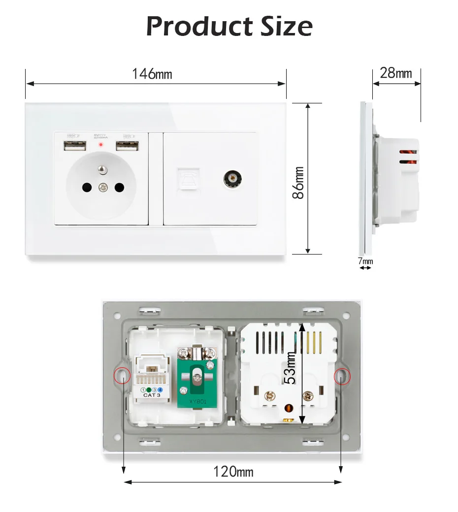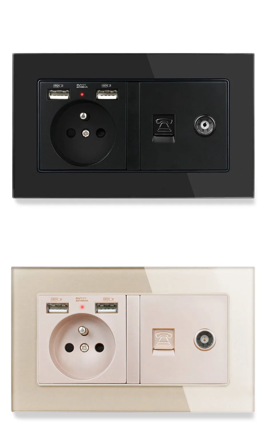 ESOOLI стеклянная панель, французская стандартная розетка с 2 usb-портом для зарядки + 1 банда, разъем для ТВ RJ11, 2 ядра, телефонный разъем
