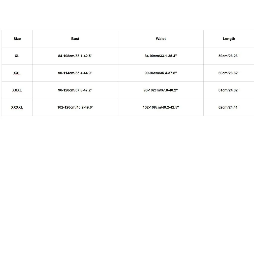 Размер Бюст Талия Длина XL 84-108 см/33,1-42,5 дюйма 84-90 см/33,1-35,4" 59 см/23,23'' XXL 90-114 см/35,4-44,9" 90-96 см/35,4-37,8" 60 см/23,62'' XХХL 96-120 см/37,8-47,2" 96-102 см/37,8-40,2" 61 см/24,02'' XXXXL 102-126 см/40,2-49,6" 102-108 см/40,2-42,5" 62 см/24,41''
