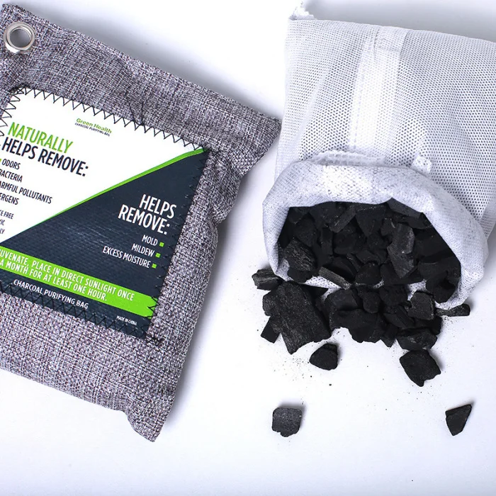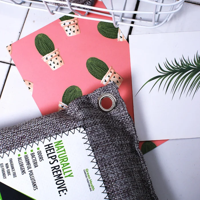 Эти новые бамбуковые угольные сумки для дома поставляются в прочном мешочке с усиленным металлическим отверстием, что позволяет легко повесить их.