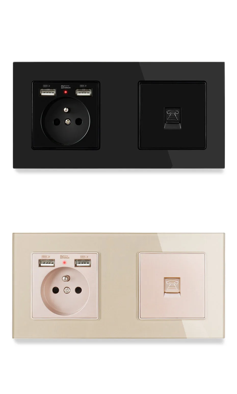 ESOOLI French Standard Electric Socket with 2 USB Charge Port +1 Gang RJ11 Telephone Connector Tempered Glass Panel 172*86mm