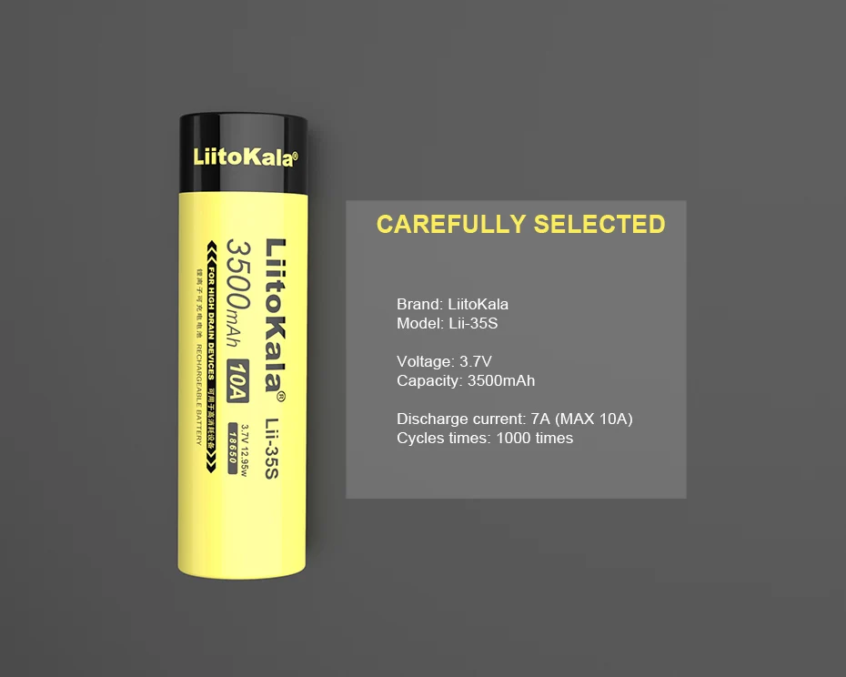 Бренд: умное устройство для зарядки никель-металлогидридных аккумуляторов от компании LiitoKala: Модель: Lii-35S Напряжение: 3,7 V Ёмкость: 3500 мАч сопротивление: разрядный ток: 7A (макс. 10A) циклов раз: 1000 раз