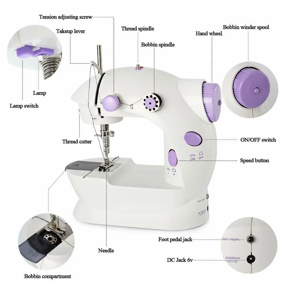 -Эта мини-электрическая швейная машина практична, которая предлагает двойные нитки для шитья, аккуратные и прямые стежки. Машина, которую вы можете сшить наволочки, шторы, шорты для маленького ребенка и т. Д. -Оснащен осветительной лампой и резцом резьбы, легко отрезать нити, лучше смотреть и удобнее в резке резьбы. -Мини-размер, легкий и с изысканным качеством изготовления. -Эта швейная машина является основной швейной машиной, с ее простой в использовании функцией, подходит для всех пользователей швейных машин.