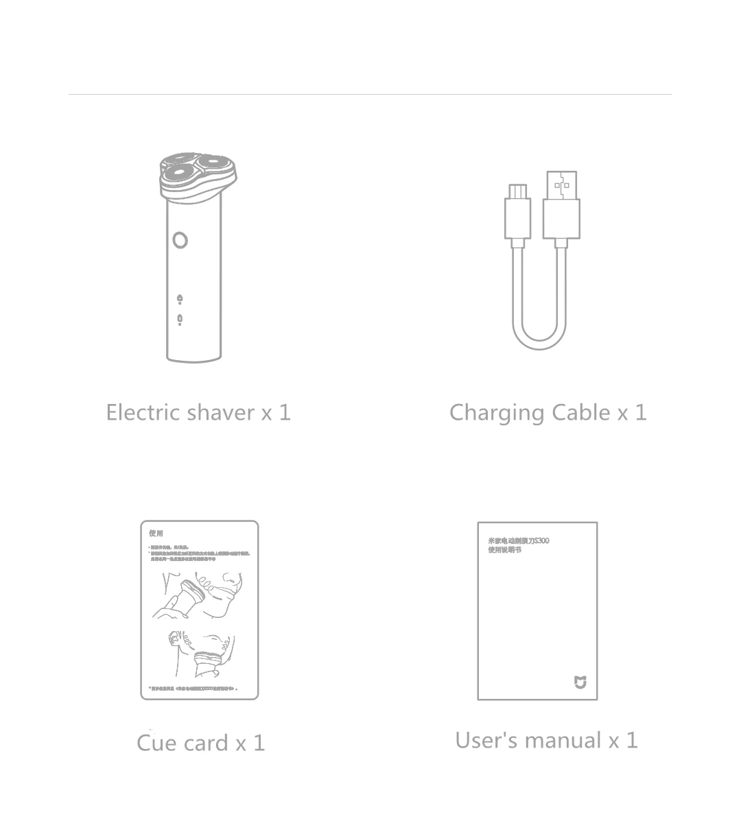 Бритва x1 Кабель для зарядки x1 Кия карты x1 Руководство по эксплуатации x1