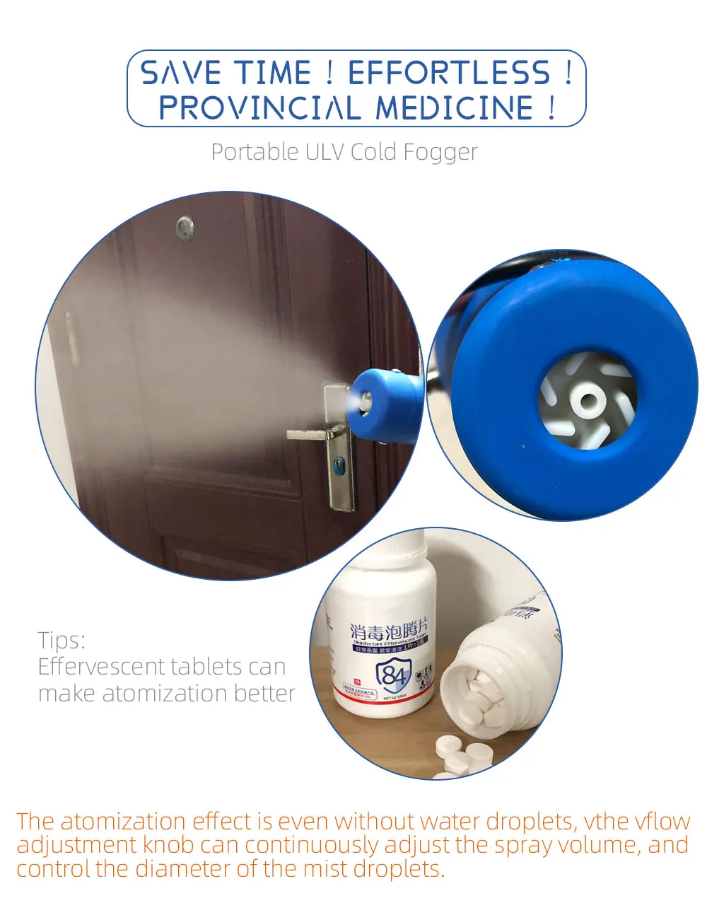 Model: Electric ULV Sprayer Medicine box capacity: 4.5L Power: 1400W Spray volume: 150-260ml / min (adjustable) Power supply: 110V-220V Range: 5-10 meters Power cord length: 5 meters Atomized particles: 20 microns (adjustable)