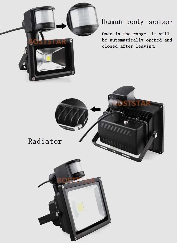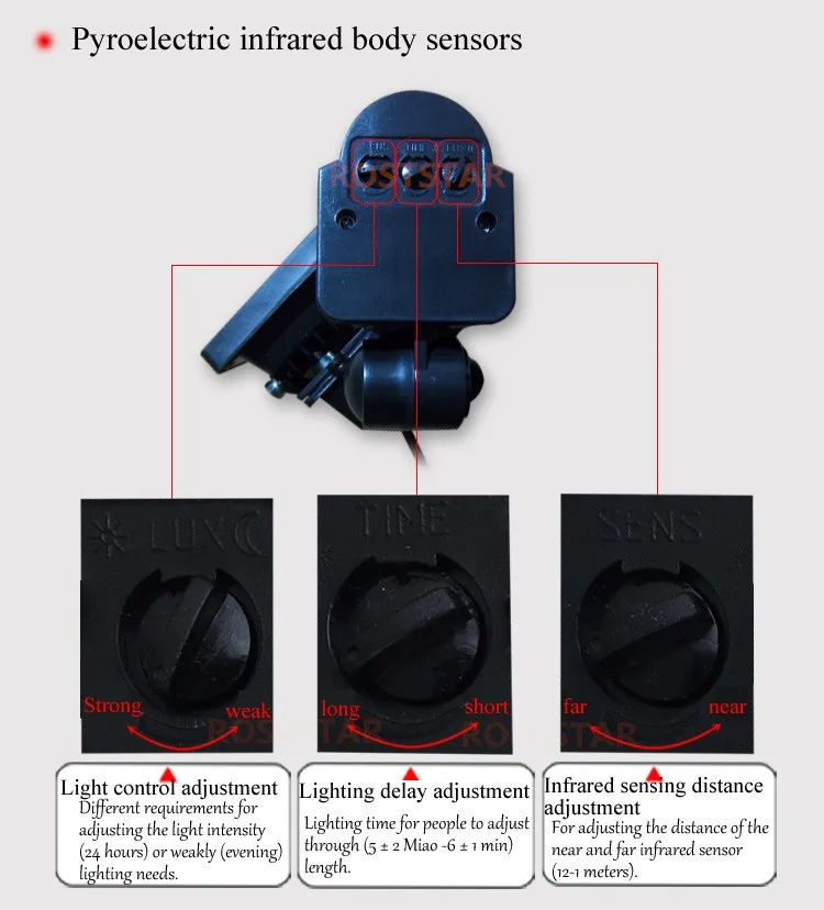 Датчик PIR: при обнаружении движения в пределах 180 градусов и максимального расстояния обнаружения 12 метров, он автоматически включается. После освещения в течение 6-360 секунд он автоматически выключится