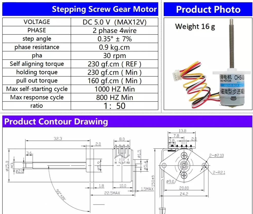 Место происхождения: Гуандун, Китай Номер модели: CHS-GM12-15BY Фаза: 2 Тип: постоянный магнит Ток/фаза: разные Сертификация: EMC Название продукта: шаговый двигатель с замкнутым контуром Название: Nema24 Применение: монитор колыбели Технические данные Угол шага: 18 ° / 50 Соотношение: 50:1 Длина вала: 33,6 м вал резьбы Сопротивление: 30 Ом/фаза Напряжение: 5v-12v