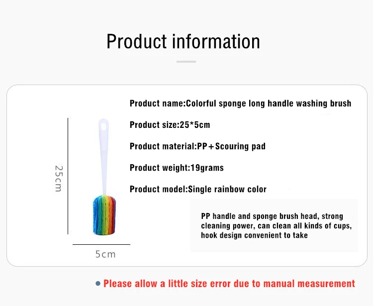 Название продукта: красочная губка с длинной ручкой Размер изделия: 25*5 см Материал изделия: ПП + губка Вес изделия: 19 грамм Модель изделия: один цвет радуги