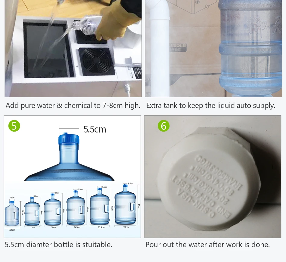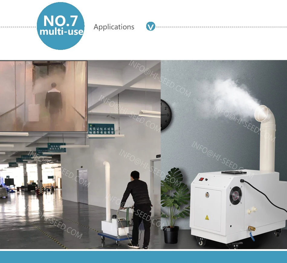 1. Мелкий распылитель 1мм-5мкм, 2. Он прочный с материалом из нержавеющей стали и пластиковым напылением. 3. Противотуманная розетка может быть соединена с ПВХ-трубкой, заказчик может самостоятельно распылить туман 4. Автоматический приток воды, автоматическая защита от переливания воды и защита от нехватки воды. (Используйте бутылку для установки и автоматического удержания воды) 5. Небольшие частицы тумана и высокая эффективность увлажнения, широко используются в различных отраслях промышленности. Не промокает поверхность может использоваться в офисе и на кухне и т. Д. 6. И может сделать дезинфекционный туннель 7,7. Подходит для порошковой таблетки и водной разработки 8. Бесшумный, не шумит во время использования