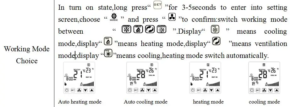 Примечание: только версия wifi поддерживает 90-240 В, но руководство не может быть обновлено вовремя, поэтому, пожалуйста, будьте уверены, что версия wifi также может поддерживать использование напряжения 110 В. Обычная версия поддерживает только 200-240 В. 1. Красивый внешний вид, большой ЖК-дисплей 2. С функцией коррекции комнатной температуры и компенсации (непосредственно реализуется через клавиши панели) 3. Отображение комнатной температуры, нагрева или охлаждения, скорости ветра или часов 4. Четыре режима скорости ветра: Автоматическая, высокая скорость, средняя скорость, низкая скорость. 5. Использование высоконадежного одночипного микрокомпьютера, сильная защита от помех 6. Может принести часы и пульт дистанционного управления 7. Корпус изготовлен из высококачественного огнезащитного материала PC + ABS. 8. Размеры: 86 × 86 × 13 мм (ширина × высота × толщина) 9. Способ установки: Стандартная 86 установка коробки 10. Пройти испытание безопасности и высокой надежности 11. Функция дистанционного управления (опционально) 12. Может управлять конечным оборудованием через сеть 13 функций блокировки ключей, выбор ручного и программируемого режима