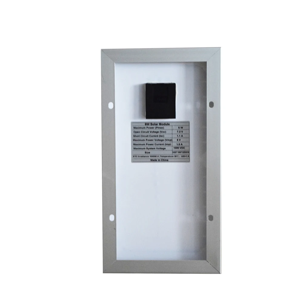 Технические характеристики изделия: Максимальная мощность (Pmax):6 Вт Холостого хода Напряжение (Voc): 7,2 V Ток короткого замыкания (Isc):1.1A Максимальное напряжение питания (Vmp):6 В Максимальный ток мощности (Imp):1A Максимальное напряжение системы (Imp): 1000DC Размер: 320*160*25 мм STC:lrradiance1000w/m2, температура 25 C, AM = 1,5 Комплектация: 1 шт. 6 Вт 6В солнечная панель