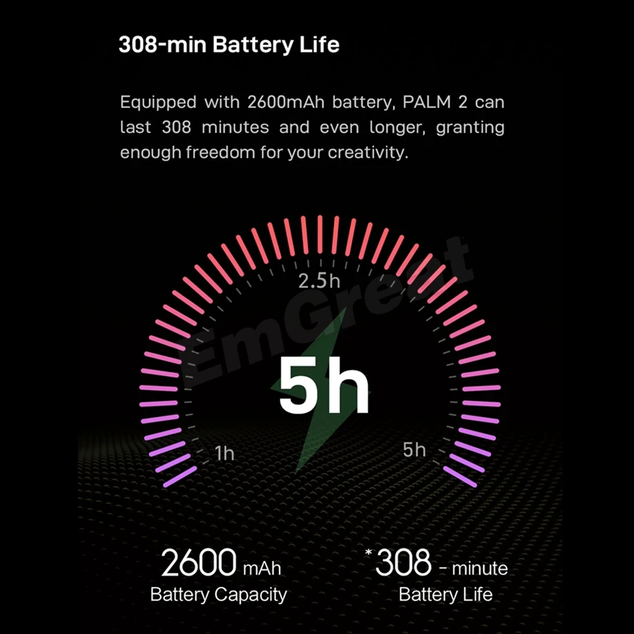 Оснащен аккумулятором 2600 мАч, карданный шарнир может работать на 308 мин и даже дольше.