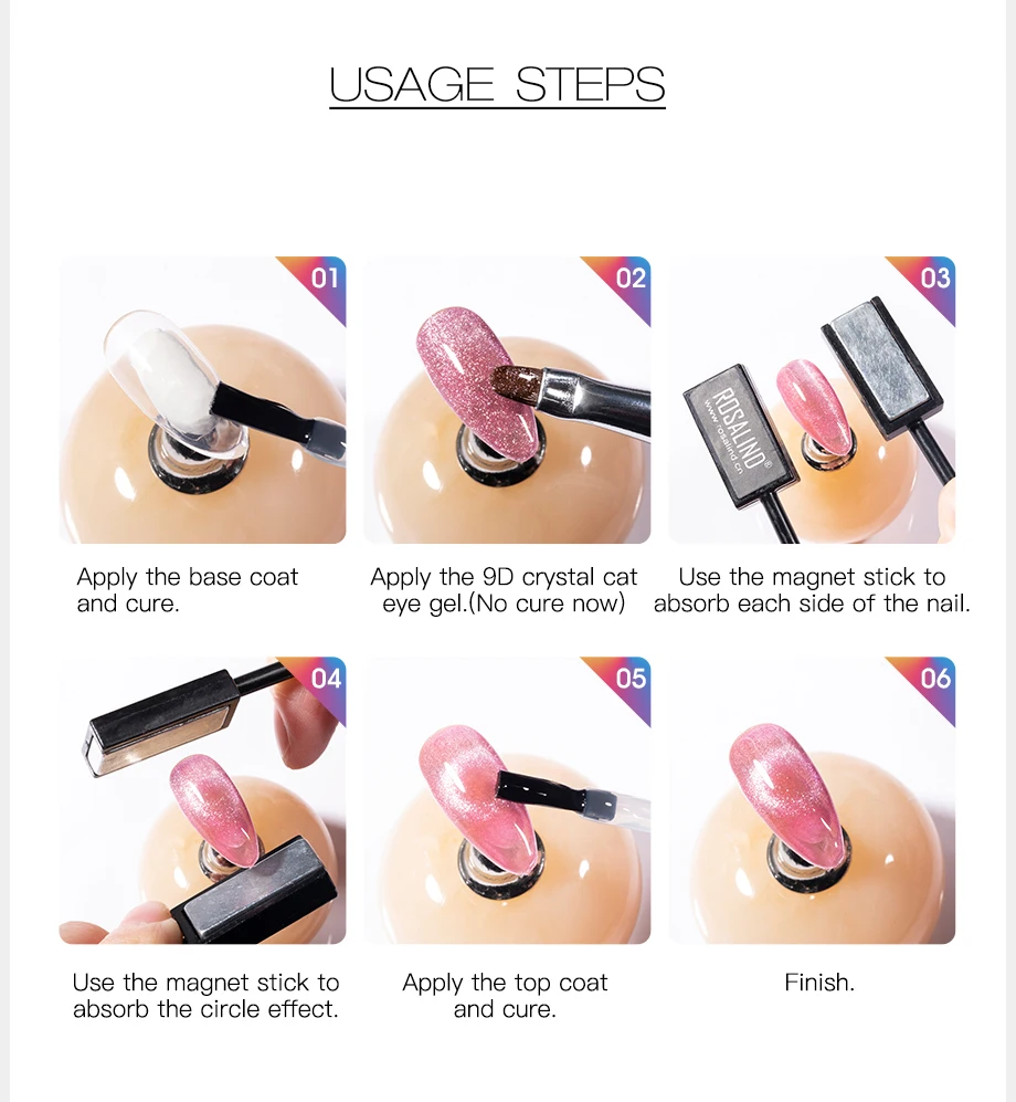 Brand: ROSALIND Name: 9D Crystal Cat Eye Gel Volume: 7 ml Color: 8 Colors Cured: UV/LED Lamp Note: Need Magnet Stick To Get The Effect