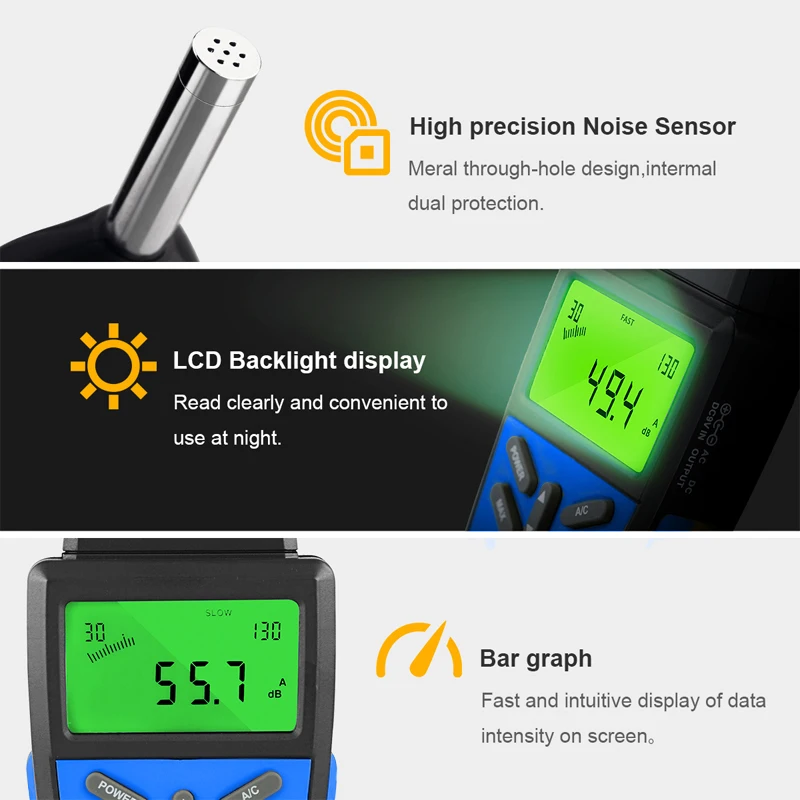 【Точные измерения и широкий диапазон▶С высокой точностью (+/-1.5dB, 0,1 дБ разрешение) и широкий диапазон измерений (30dBA-130dBA), измеритель уровня шума-это полезное устройство для измерения шума беговых машин, музыки, ближнего или речевой терапии и т. д.