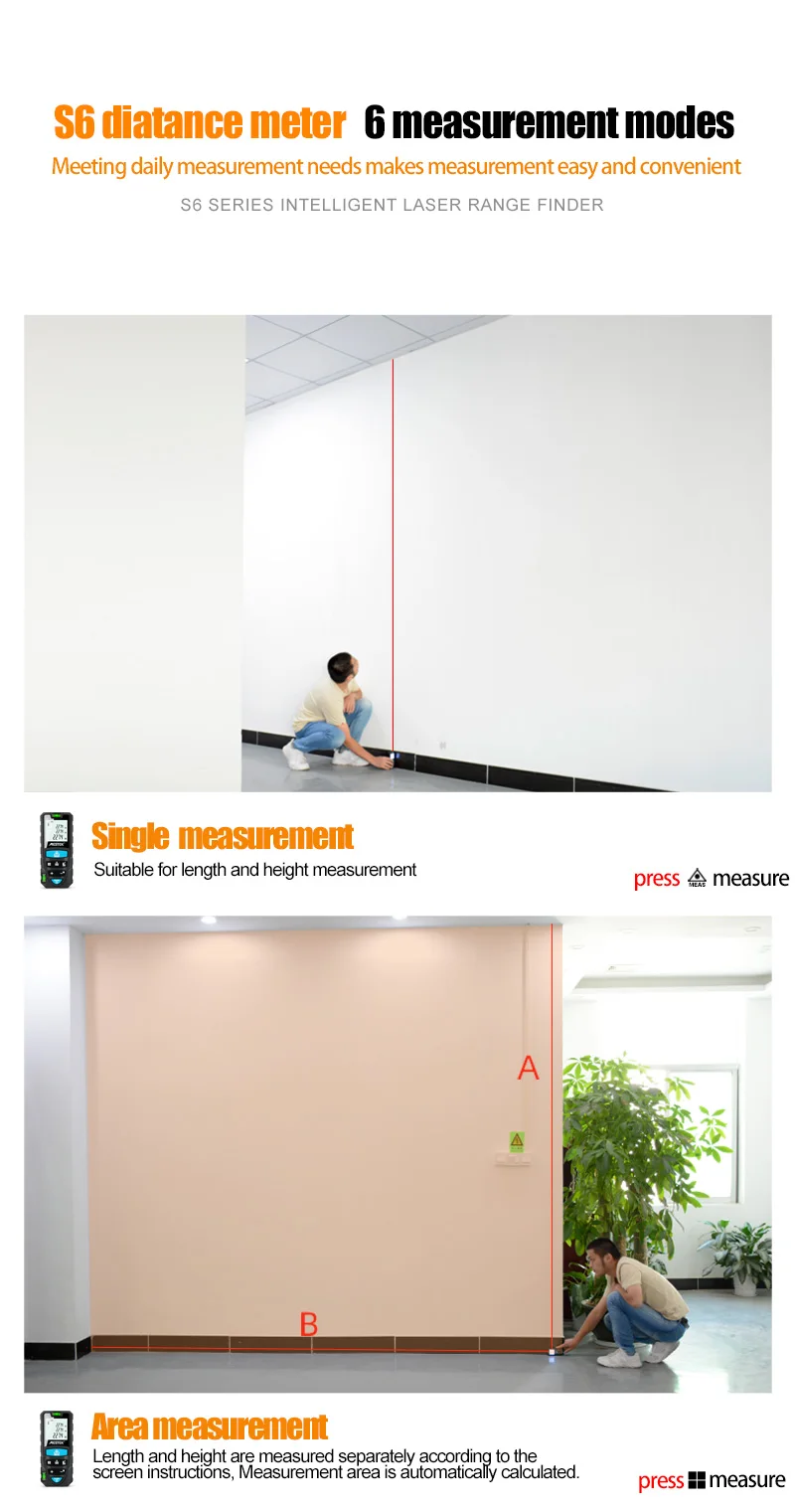 2) измерение площади-длина и высота измеряются отдельно в соответствии с инструкциями по экрану, площадь измерения автоматически рассчитывается.