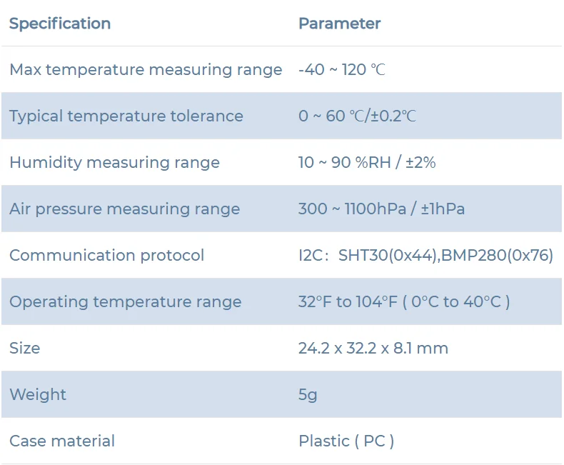 ENV II-это датчик окружающей среды, который используется для измерения температуры, влажности и атмосферного давления. Он построен с SHT30 и BMP280. Поддержка интерфейса I2C, SHT30-это цифровой датчик температуры и влажности с высокой точностью и низким энергопотреблением. BMP280 является абсолютным барометрическим датчиком давления, который специально разработан для мобильных приложений. Он обеспечивает максимальную гибкость для оптимизации устройства в отношении энергопотребления, разрешения и производительности фильтра.