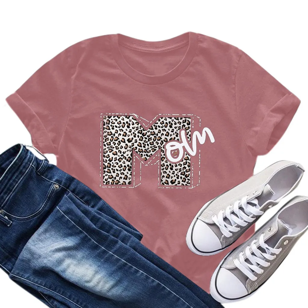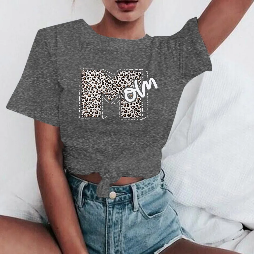 Женские леопардовые буквы с круглым вырезом и коротким рукавом Футболка с принтом.