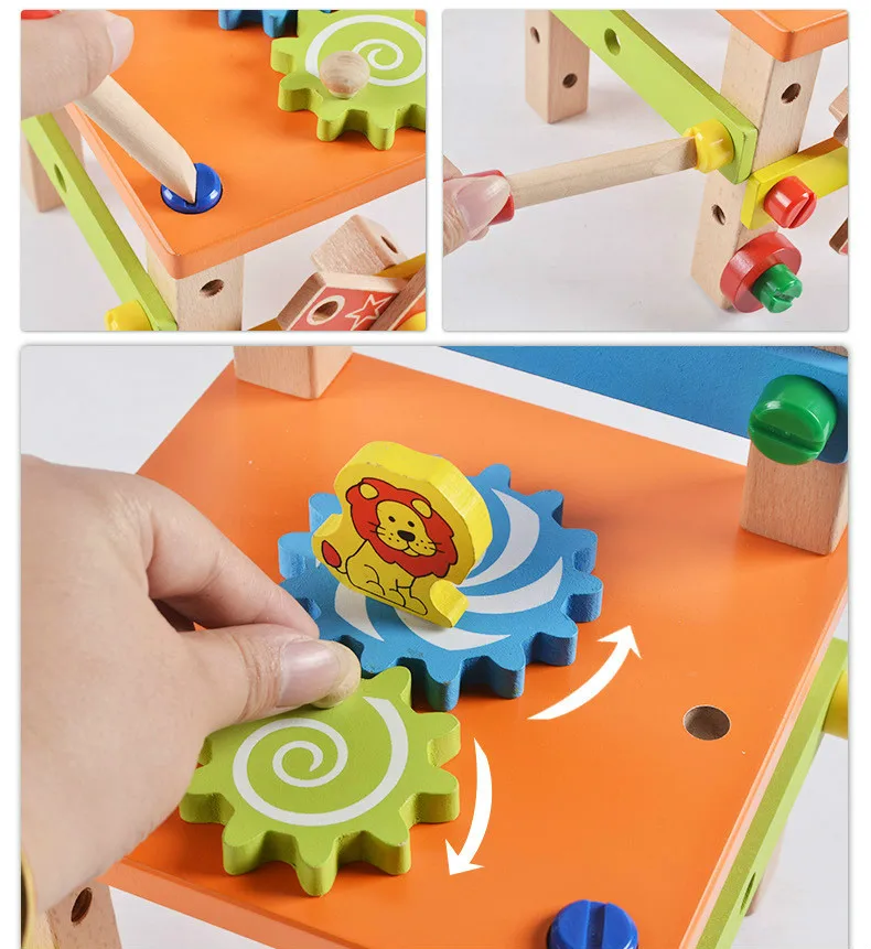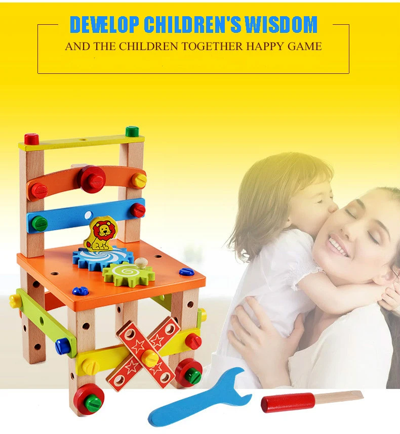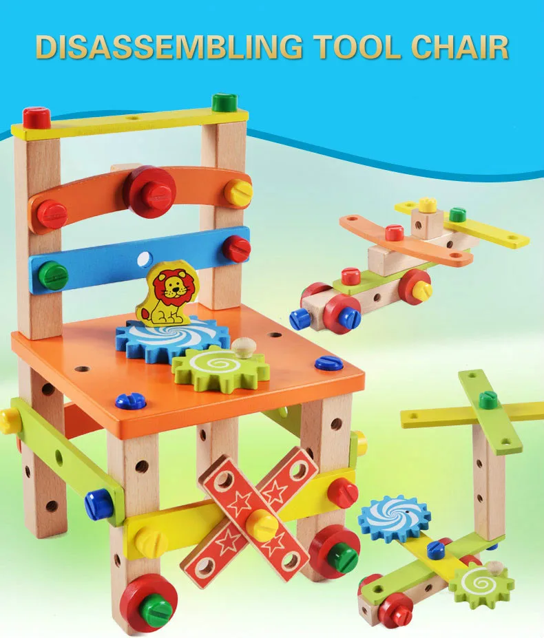 Маленький молоток может быть сложен, отвертка может нести винт, и весь стул может быть удален! Развивайте зрительно-моторную координацию ребенка и пусть ребенок выдает эмоции приемлемым образом. Вдохновьте вашего ребенка снова собрать его обратно к оригиналу. Может также осуществлять трехмерную способность мышления ребенка и цель развития воображения.