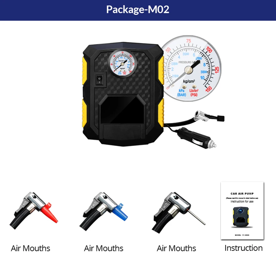 -1 x воздушный насос с указателем -3 воздушных насадки -Руководство пользователя-1 шт. -Кабель питания 3 метра-1 шт.